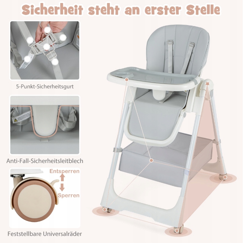 Стабильность i безопасность – приоритет : Складной детский стульчик, опирающийся на прочные ножки из нержавеющей стали, обеспечивает надежную устойчивость и долговечность. Кроме того, 5-точечный ремень безопасности и барьер для защиты от падения эффективно предотвращают случайное скольжение или падение.