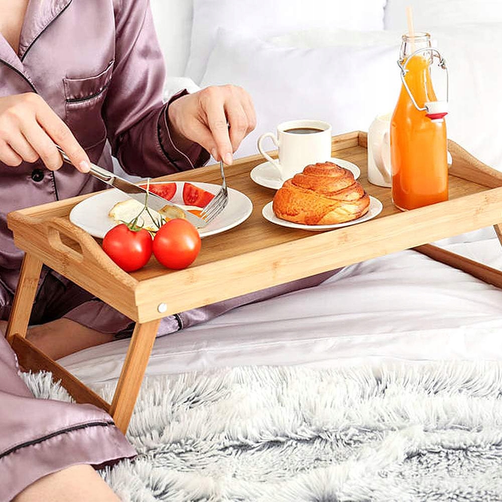 Столешница размером 50 х 30 см достаточно просторна, чтобы вместить завтрак. тарелка, чашка кофе, столовые приборы и другие предметы. В свою очередь, ручки с обеих сторон облегчают переноску.