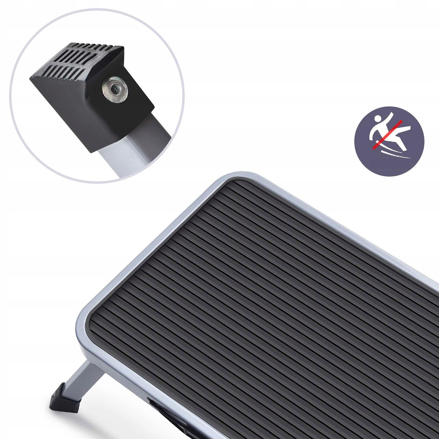 Подставка для ног изготовлена из прочной стали. 4 ножки устойчиво поддерживают лестницу, а 4 нескользящие ножки не позволяют пользователям скользить, стоя на лестнице.