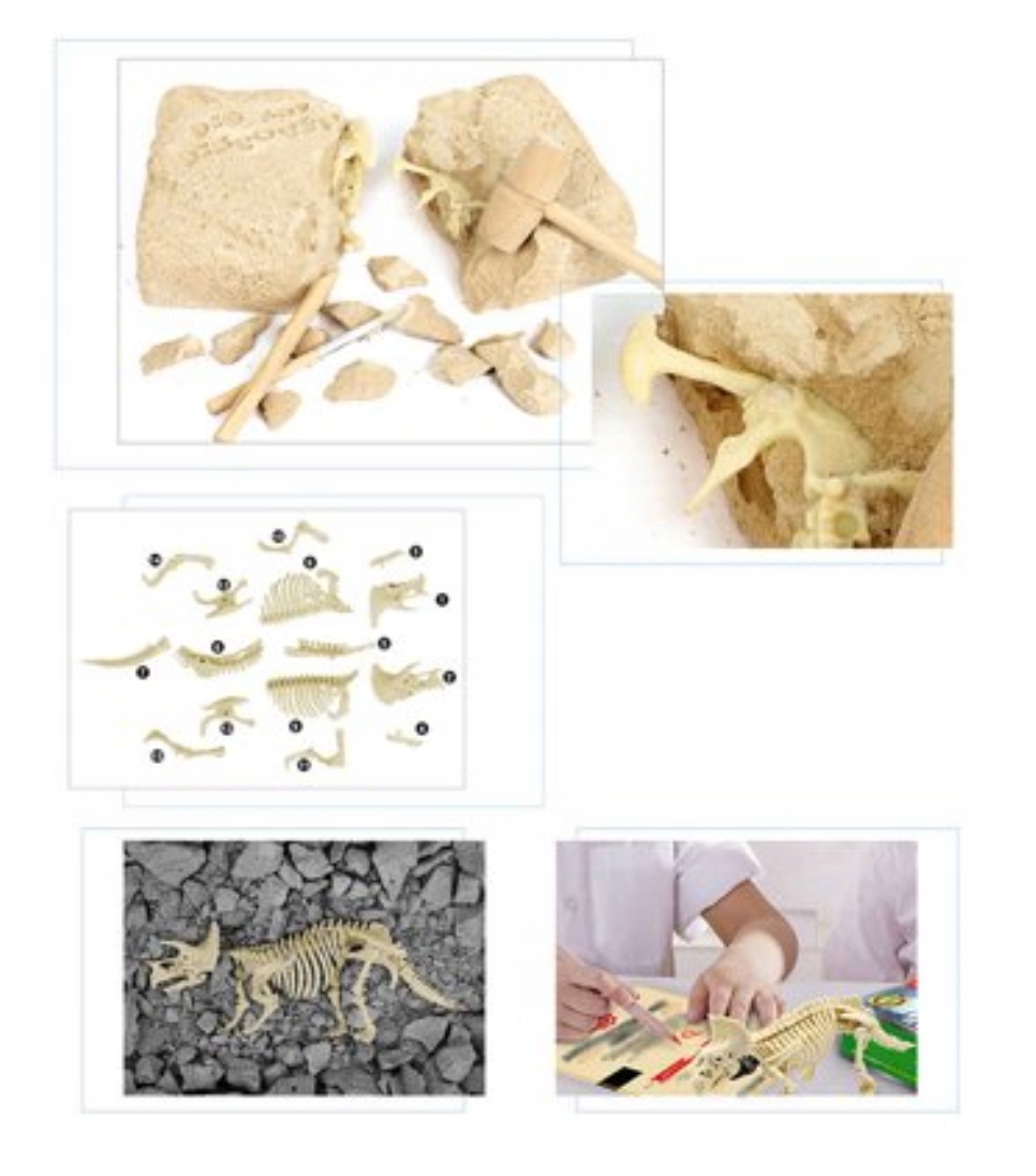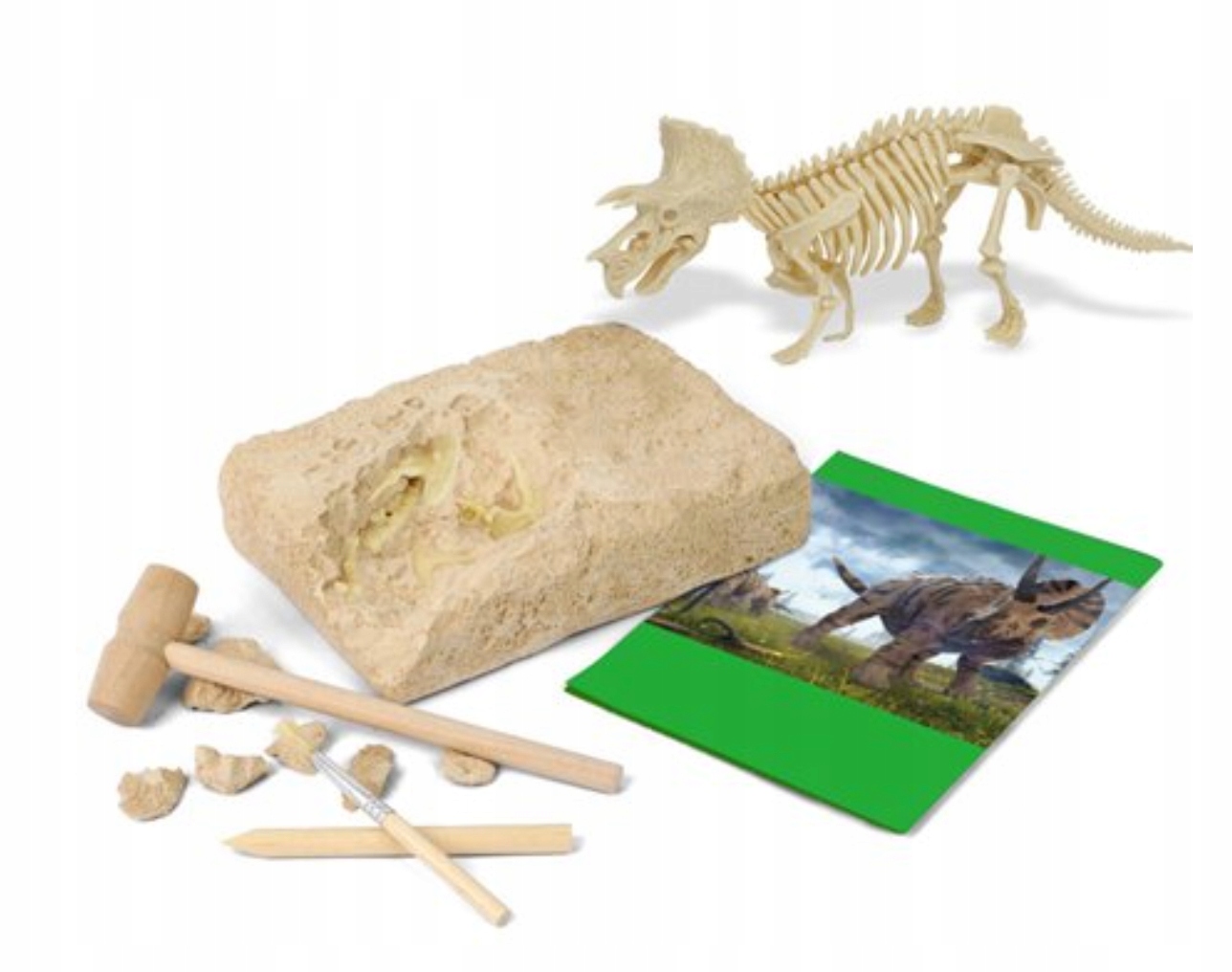 Набор для юного учёного. В блоке спрятан скелет динозавра, который нужно раскопать с помощью инструментов, входящих в набор, а затем соединить кости, чтобы получить скелет трицератопса.