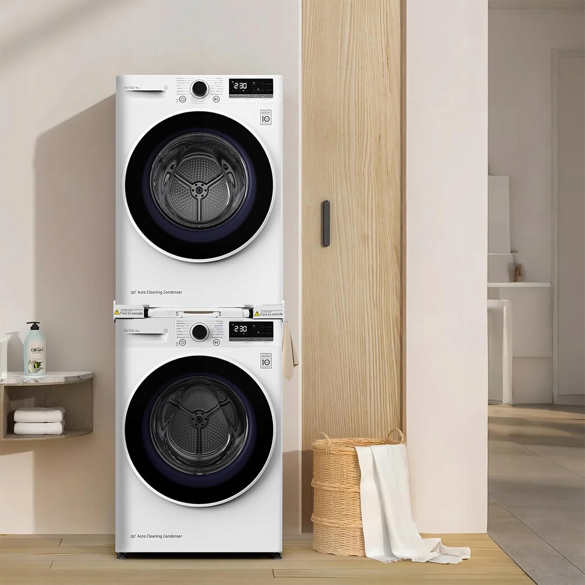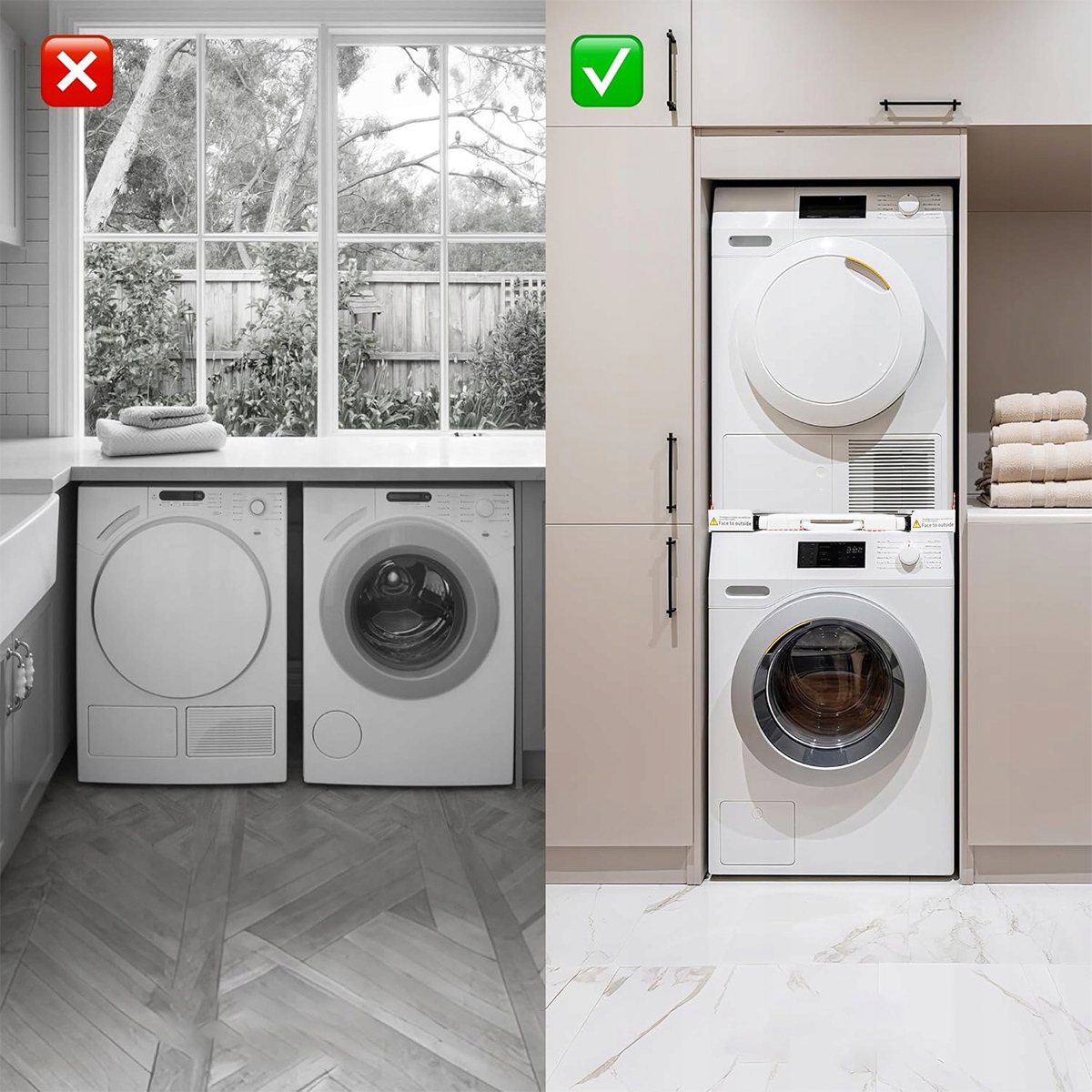 Комплект для штабелирования стиральных машин — идеальное решение для штабелирования стиральных и сушильных машин. Это позволяет сэкономить пространство дома и создать удобную постирочную зону даже в небольших квартирах. Штабелируемая рама универсальна и совместима с устройствами Bosch, Siemens, Miele, Samsung, LG, Haier, Beko, AEG, Bauknecht и других производителей.