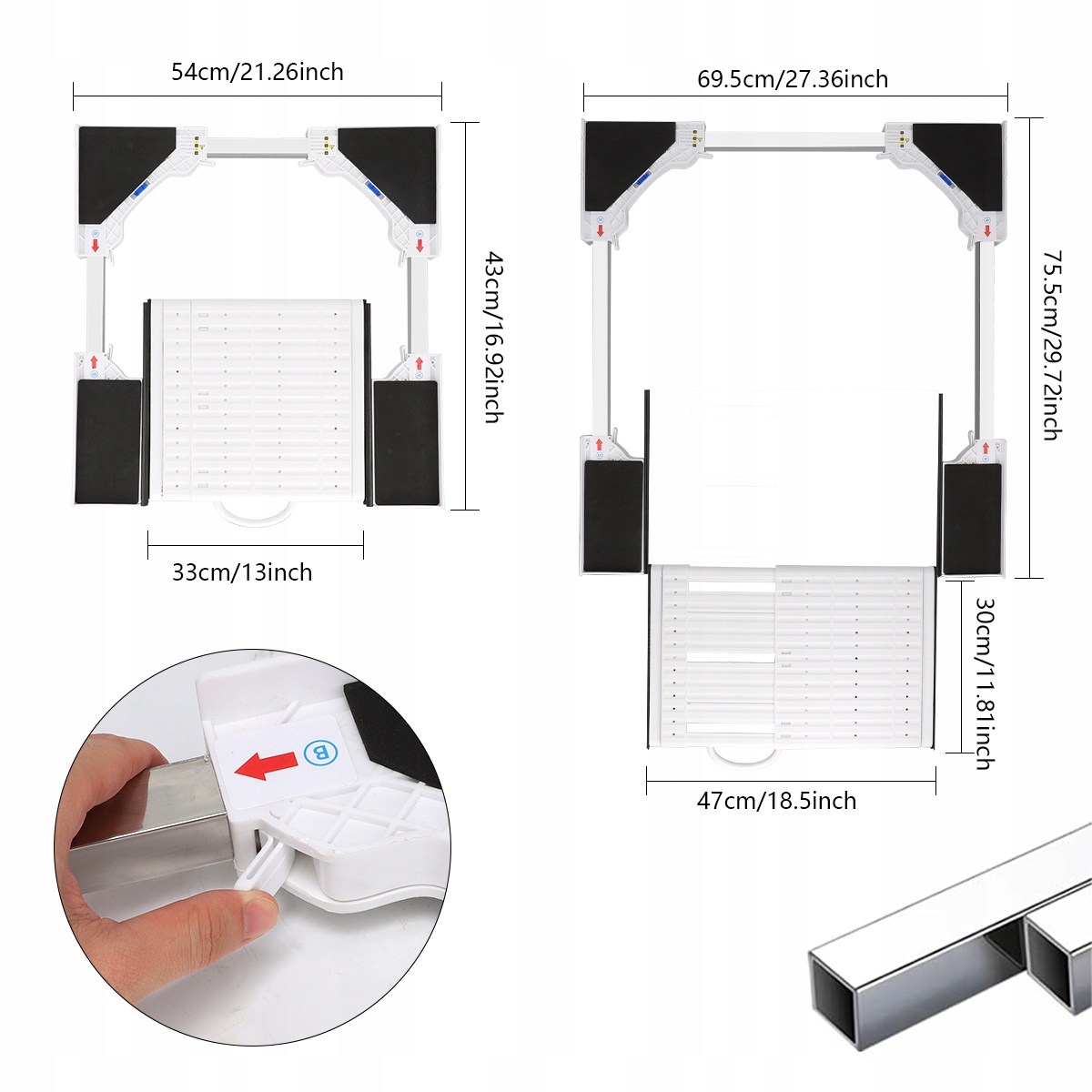 Размер нашей штабелируемой рамы регулируется и подходит для всех стиральных и сушильных машин глубиной 54–69,5 см. Простая сборка всего за несколько минут. Благодаря своим размерам эти рамки универсальны и подходят практически ко всем стиральным и сушильным машинам.