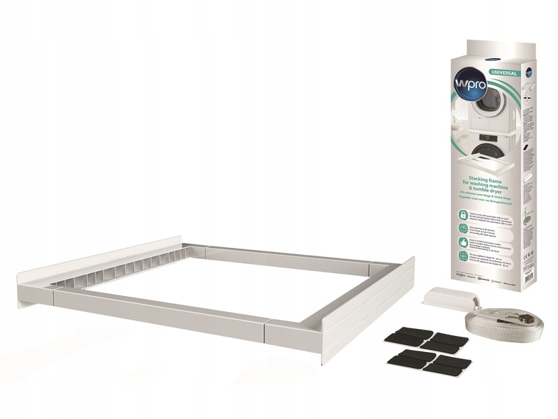 Соединитель для стиральной машины и сушилки WHIRLPOOL WPRO KCL103 позволяет безопасно установить сушильную машину на стиральную машину без каких-либо дополнительных креплений. В комплект входят: разъем (60 х 60 х 7 см), ремень, противоскользящие накладки, чехол на ремень.