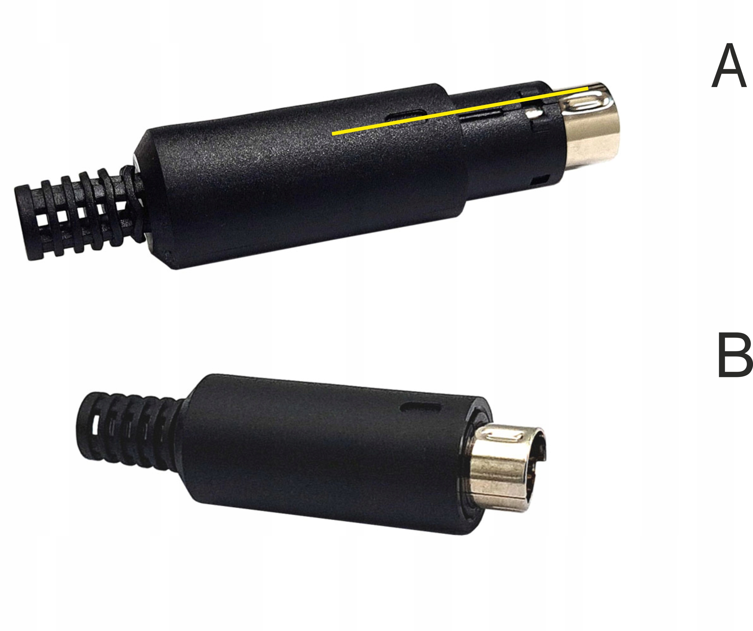 После пайки проводов соберите вилку таким образом, чтобы видимая выемка на корпусе находилась на одной линии (желтая линия) с выемкой на пластиковых элементах крышки вилочного разъема