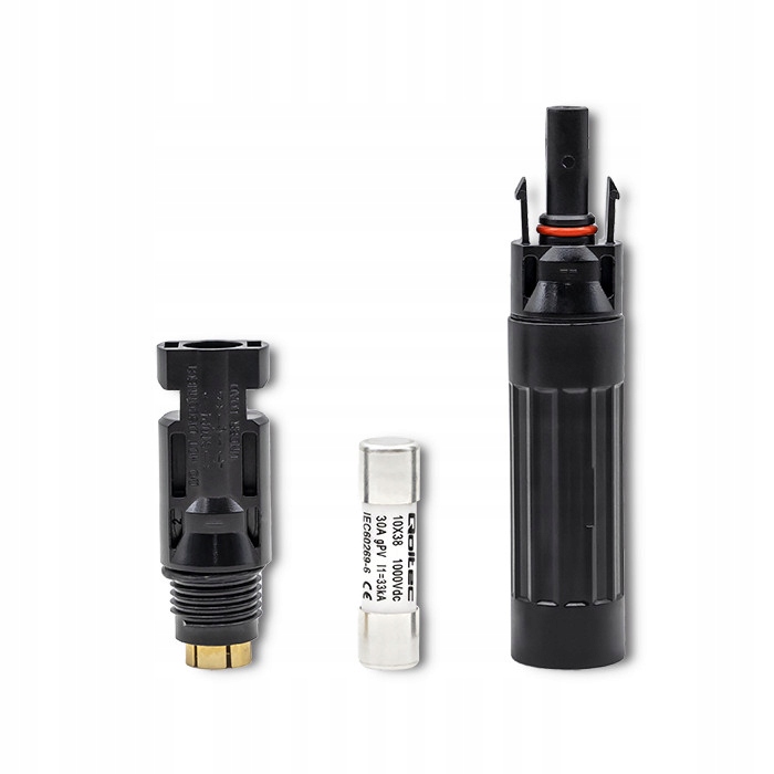 Разъемы Qoltec используются для подключения фотоэлектрических панелей в фотоэлектрических установках с использованием соответствующих солнечных кабелей, которые также доступны в нашем предложении. В них имеется место для установки цилиндрической предохранительной вставки 10х38. Вставка на 1000 В входит в комплект. Разъем защищает контроллеры зарядки или сетевые инверторы от ударов молнии.