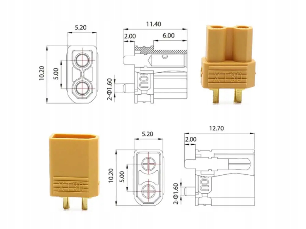 Вилка и розетка XT30 представляет собой сильноточный разъем превосходного качества с высокими электрическими и изоляционными параметрами. Разъем XT30 представляет собой очень надежное соединение аккумулятора. Он идеально подходит для моделирования и систем питания, используемых в электронике.