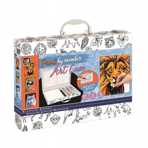 В комплект входят: 3 полотна с изображением льва, попугая и волка, краски 21 цвета, 3 кисточки. Все упаковано в красивый чемодан, который можно взять с собой куда угодно.