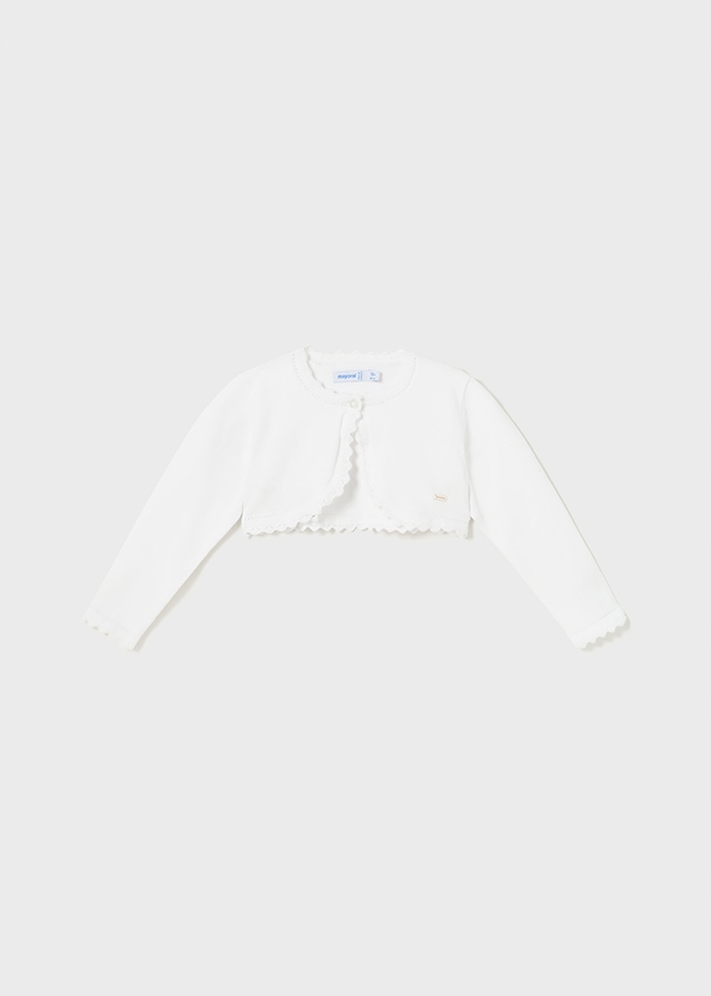 Свитер-болеро из экологически чистого хлопка для девочек. Застежка на одну пуговицу. Трикотажная ткань, нежная и приятная на ощупь. Украшения: ажурные элементы.