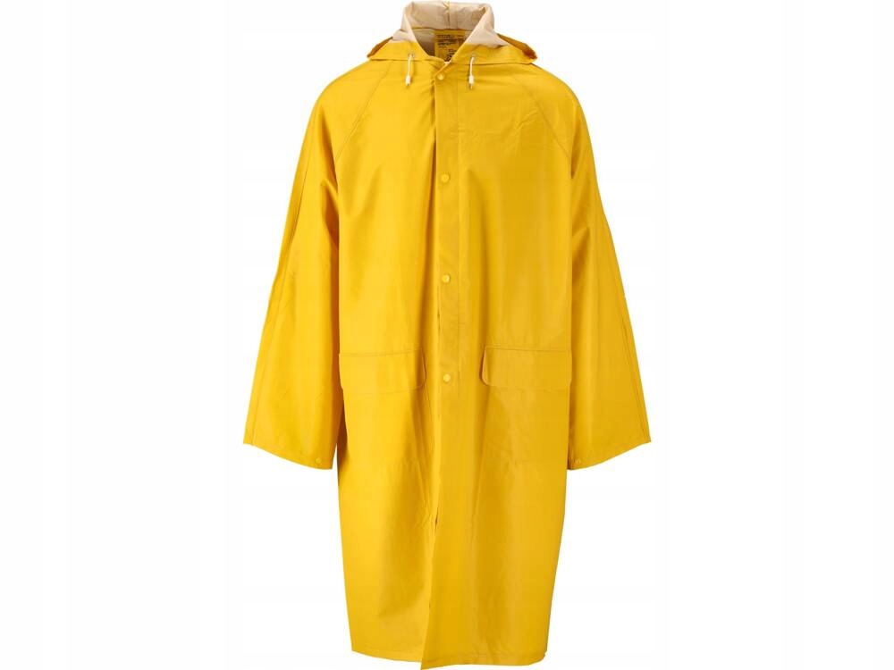 Желтый плащ, 70% ПВХ, 30% полиэстера . Закреплен с молнией с дополнительными крепежными элементами. Капюшон натягивается на ремнях, два наружных кармана , ветряная, готовящаяся к ветру. Вентиляционная система на спине. размер XXL