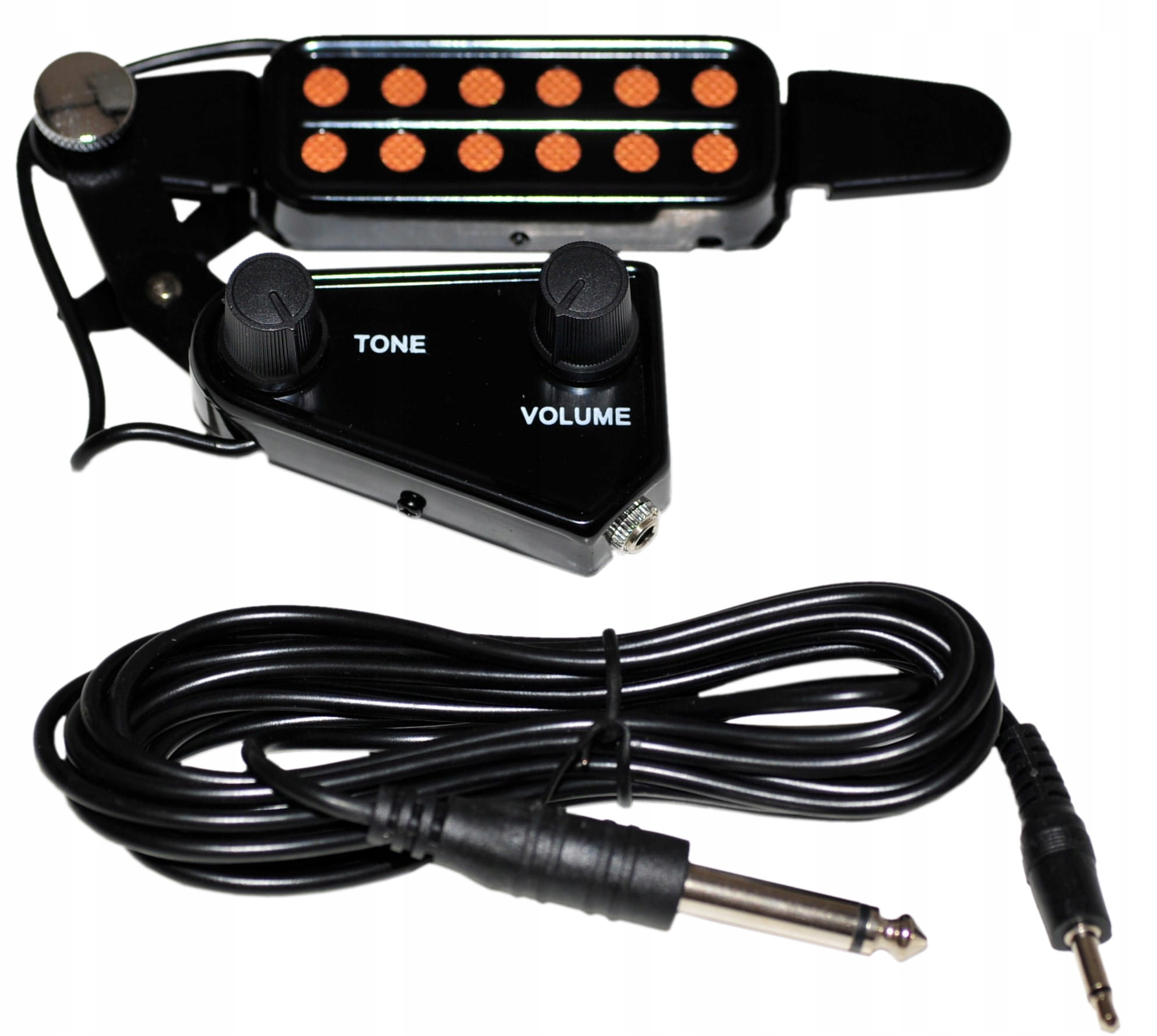 Это изящное устройство вставляется в звуковое отверстие гитары и позволяет усиливать инструмент через систему электромагнитных преобразователей. Установить насадку не составит труда. Просто помещаем его под струны и вставляем верхнюю пластину в специальную прорезь резонатора. Затем прижимаем вторую ногу, чтобы стабилизировать крепление. Регуляторы громкости и тембра можно настроить благодаря подвижному шарниру, чтобы они не мешали нам при перекусе. Дополнительным преимуществом является съемный легкий кабель с двумя штекерами Jack — штекером 3,5 мм для приставки и штекером 6,5 мм для усилителя. Приложение небольшого размера, поэтому поместится в любой футляр.