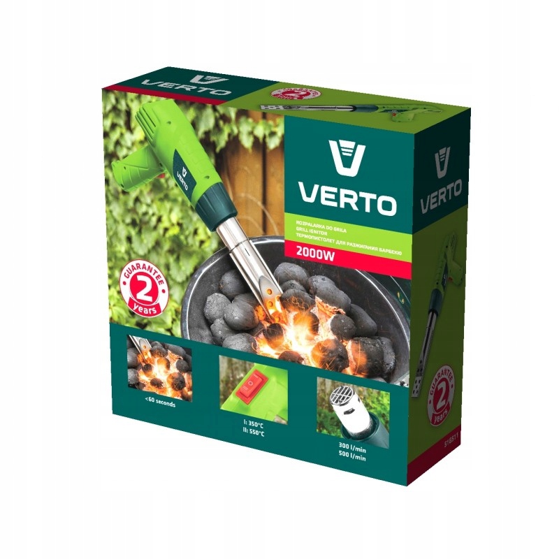 • Зажигалка для гриля VERTO 2000Вт, представляющая собой комбинацию тепловой пушки и специализированной насадки, позволяет быстро разжечь угольный гриль.