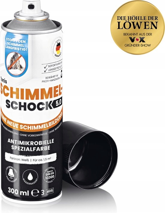 Tonis SchimmelSchock 5.0 / Spray — белая специальная аэрозольная краска для поверхностей стен и потолков на основе дисперсии профессионального качества в соответствии со стандартом DIN EN 13300. Обогащенная высококачественными фунгицидами в качестве биоцидного продукта, обеспечивает длительную защиту. против проникновения плесени. В ходе научно смоделированных испытаний на старение (в соответствии со стандартом испытаний ASTM G21-15 2021) в течение 5-летнего периода наблюдения в Toni's SchimmelSchock 5.0 не было обнаружено роста плесени. Tonis SchimmelSchock 5.0 / Spray — оптимальная аэрозольная краска для каждого дома, обеспечивающая длительную защиту поверхностей стен и потолков, не содержащих плесени. Подходит для различных поверхностей, таких как штукатурка, бетон, силикатный кирпич, древесно-стружечные обои, минеральные краски, старые краски, гипсокартон.