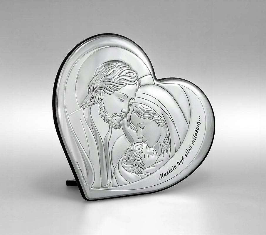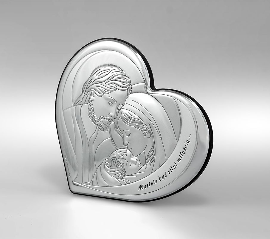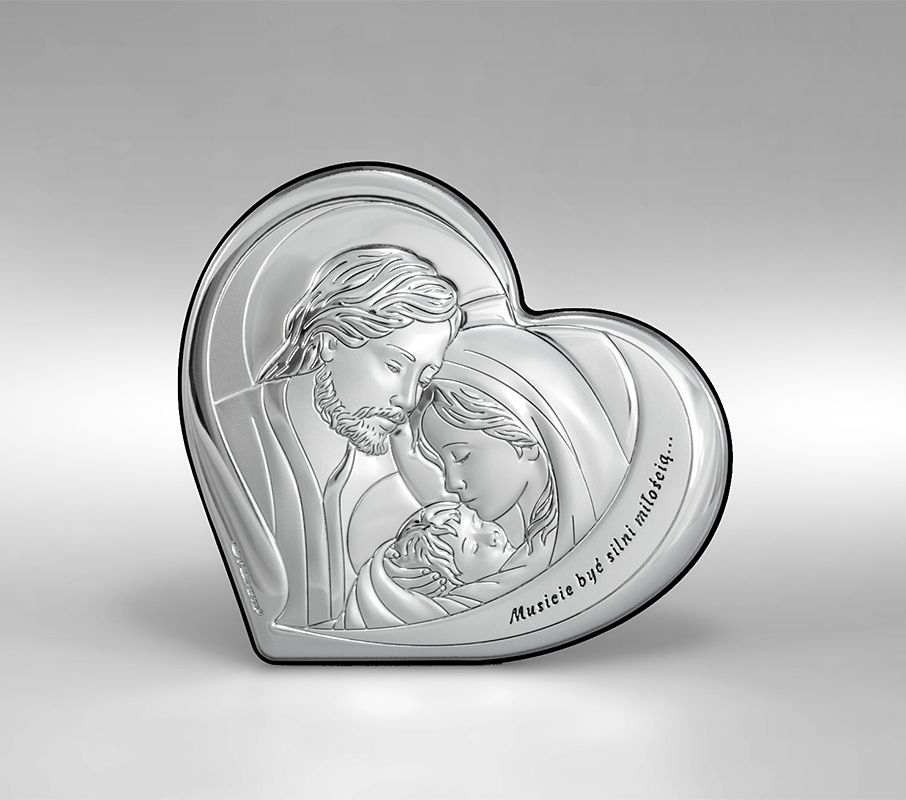 Картина на серебре в сердечке с изображением Святого Семейства с Младенцем с надписью «Любовью надо сильны...».