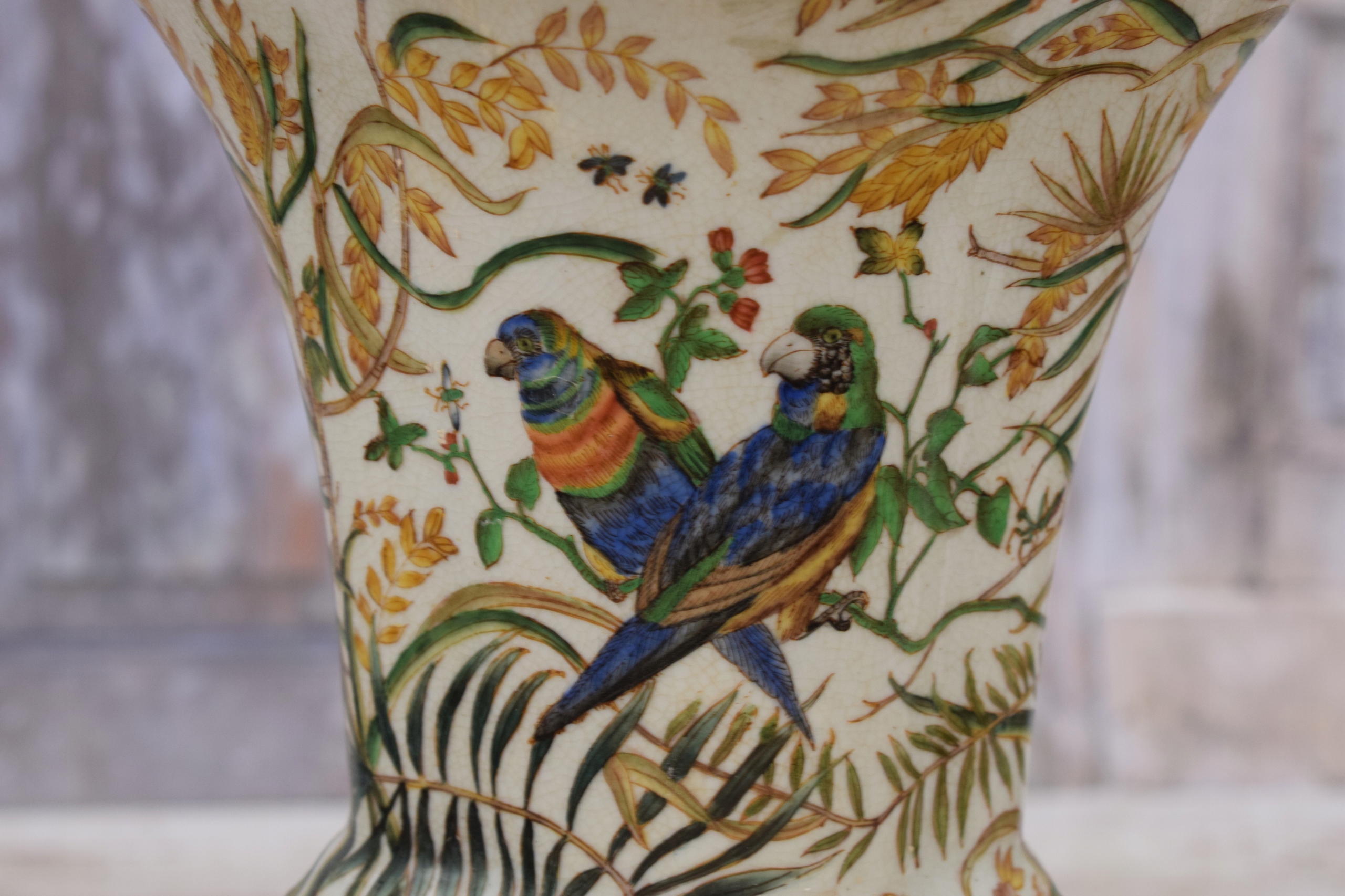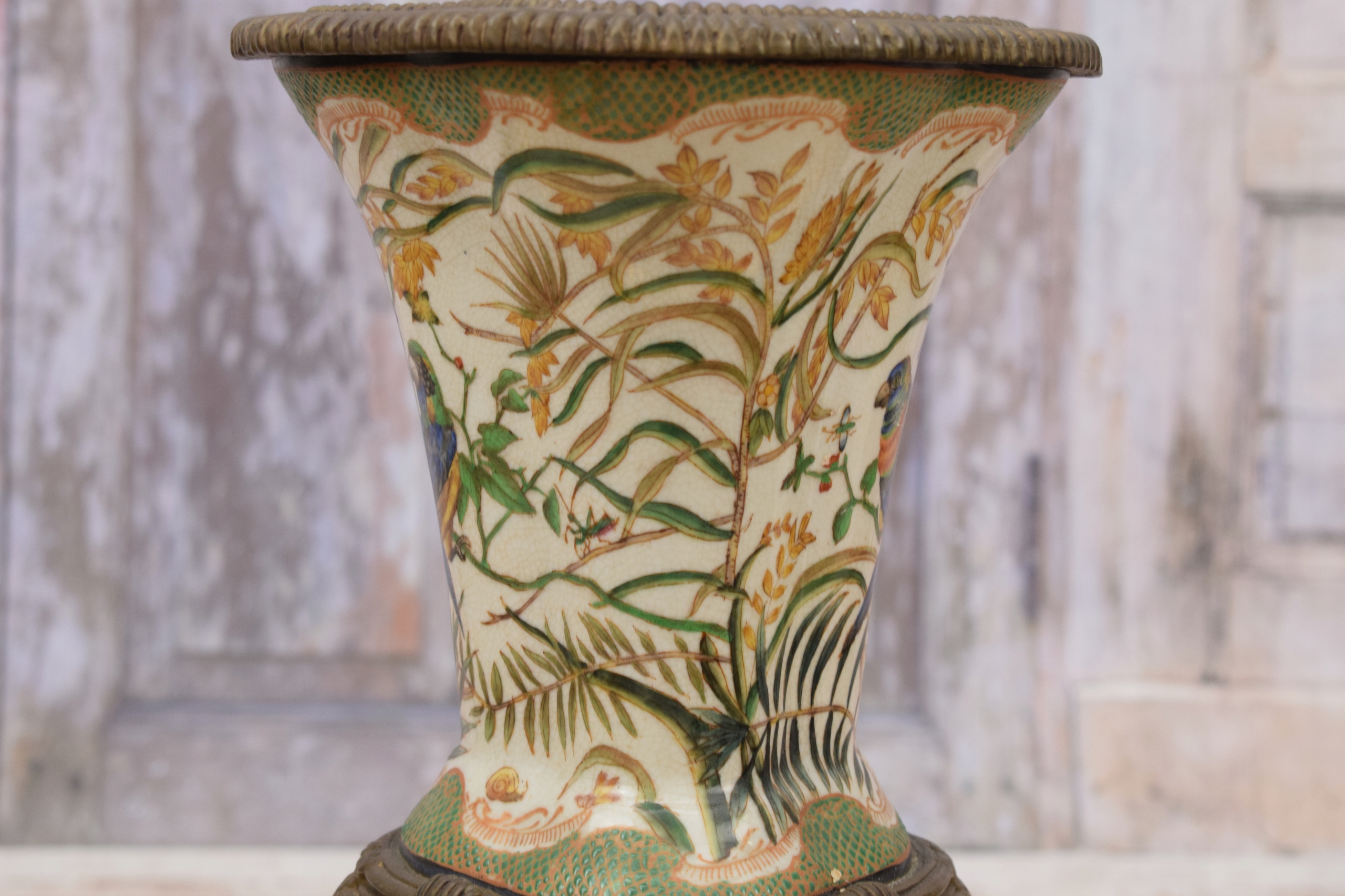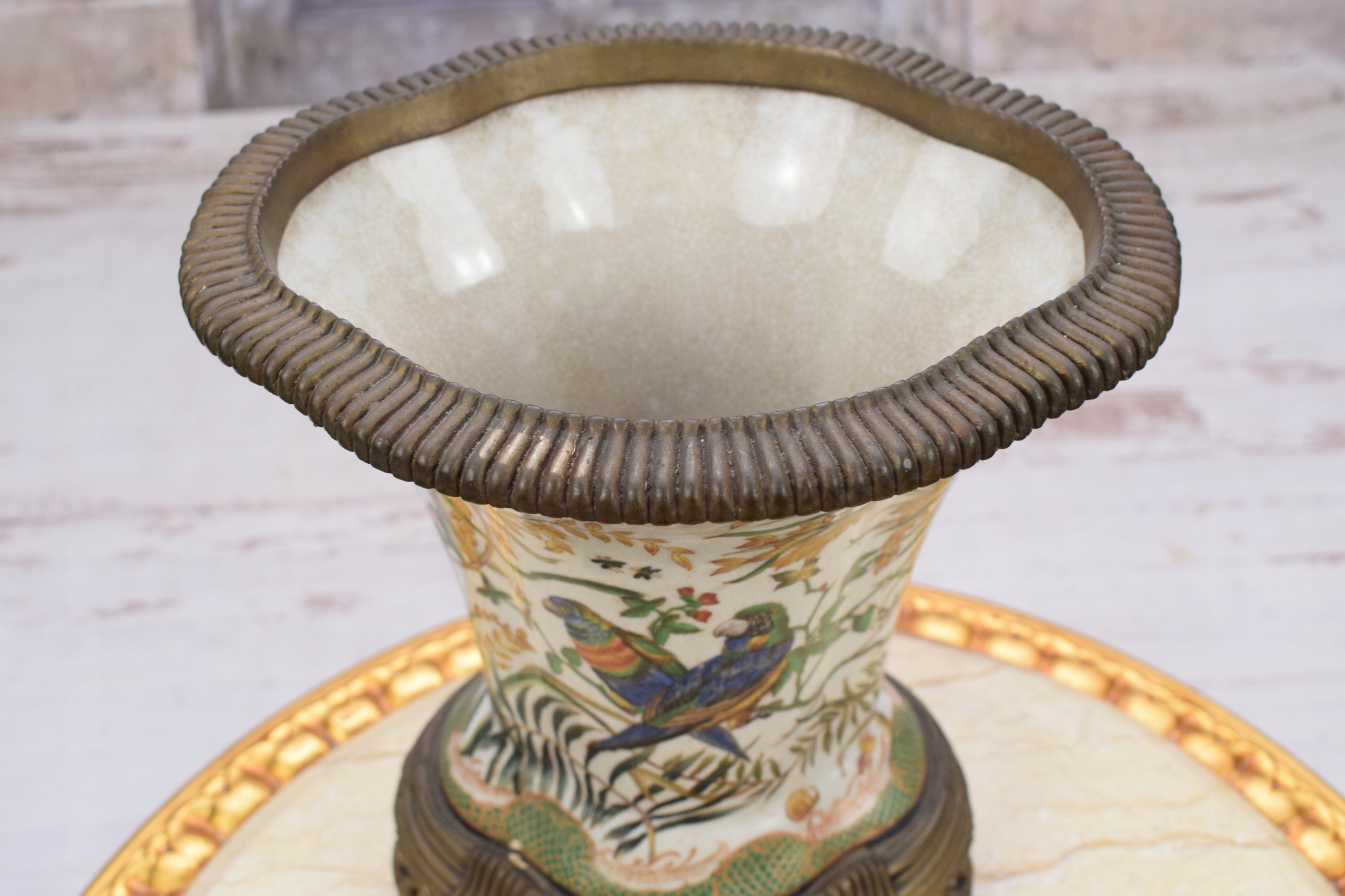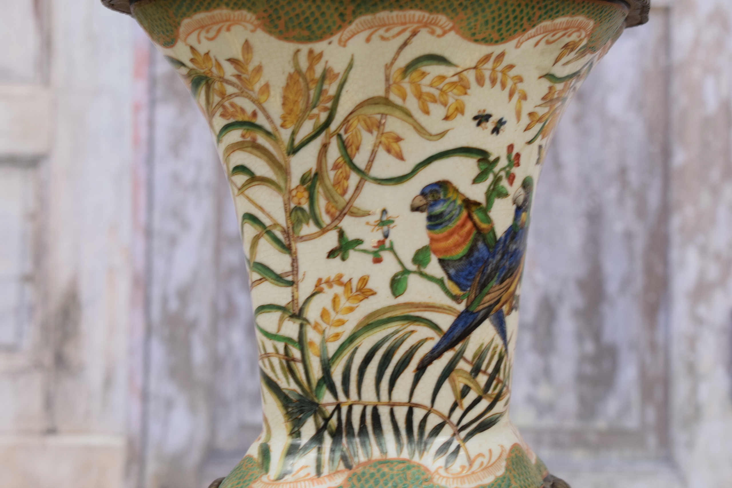 Розписна порцелянова ваза - Папуги - Квіти - Бронза - Амфора - Арт-нуво