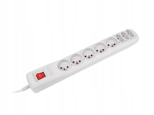 Линия оснащена 5 розетками с заземлением, 3 плоскими розетками без защитного контакта, автоматическим предохранителем и выключателем на работа с сигнальной лампочкой. Токопроводящий корпус и простой монтаж на земле или стене обеспечивают комфортное и безопасное использование.