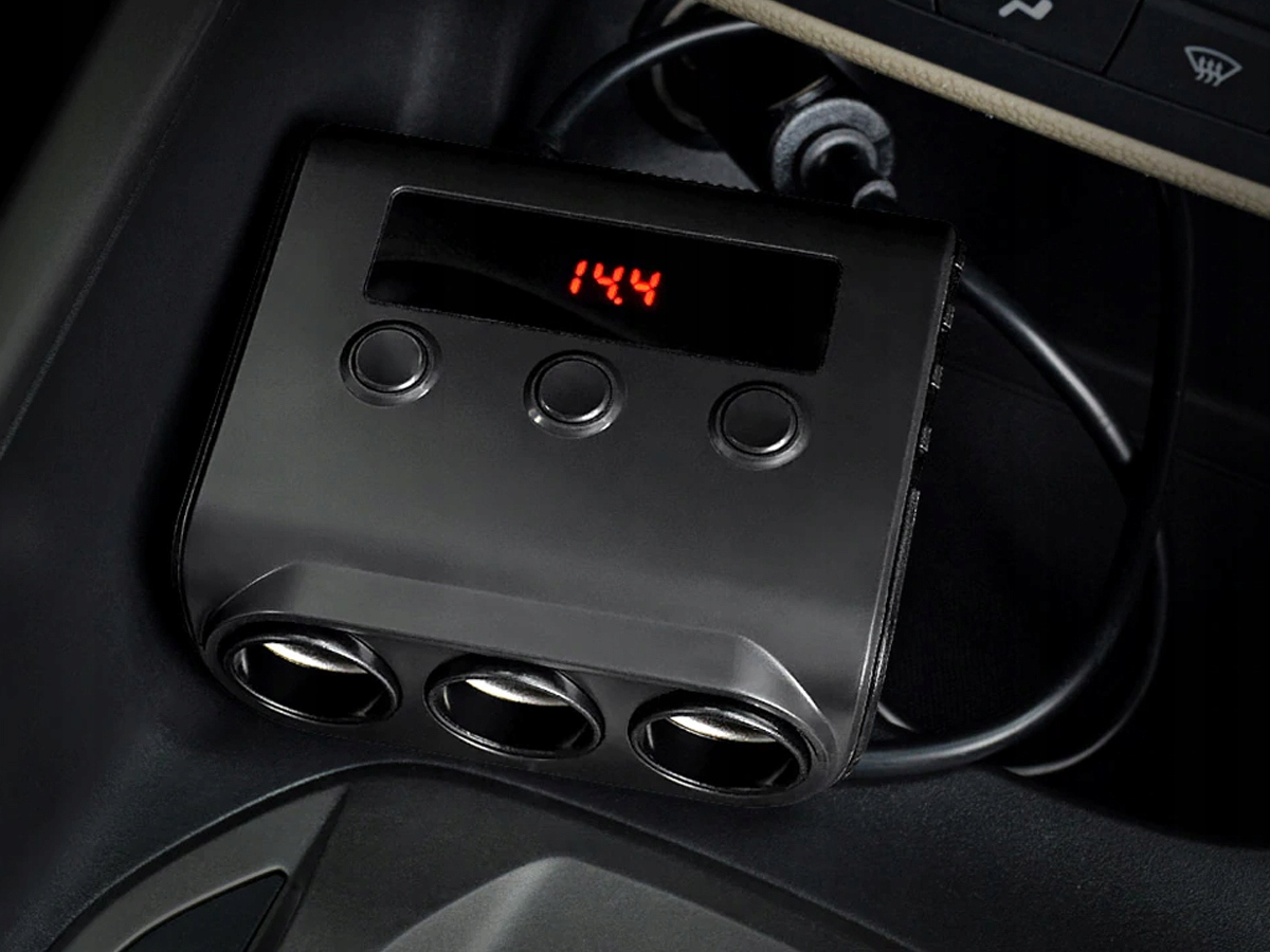Благодаря тройному разветвителю мы можем одновременно подключать больше устройств, например автомобильную камеру. Он также имеет 4 порта USB, которые позволят заряжать еще больше устройств одновременно. За каждым гнездом прикуривателя закреплена отдельная кнопка. Когда мы не используем устройство, мы можем выключить его сзади, не отключая прикуриватель.
