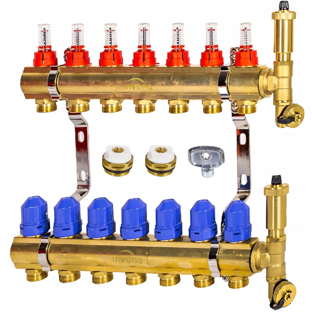 ✔️ Коллектор INVENA PM-05-007 (7 контуров) – латунные балки (2 шт), кронштейны монтажные (2 шт), 7 регулирующих клапанов с ротаметрами (2,5 л/мин), 7 термостатических вставок (под приводы), 2 латунных тройника, 2 сливных клапана, 2 автоматических воздухоотводчика 1/2", 2 ручных воздухоотводчика 1/2", кровоточащий ключ.