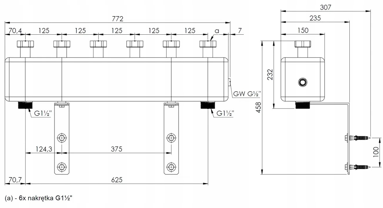 - подключения со стороны установки: 6x гайка G1½"