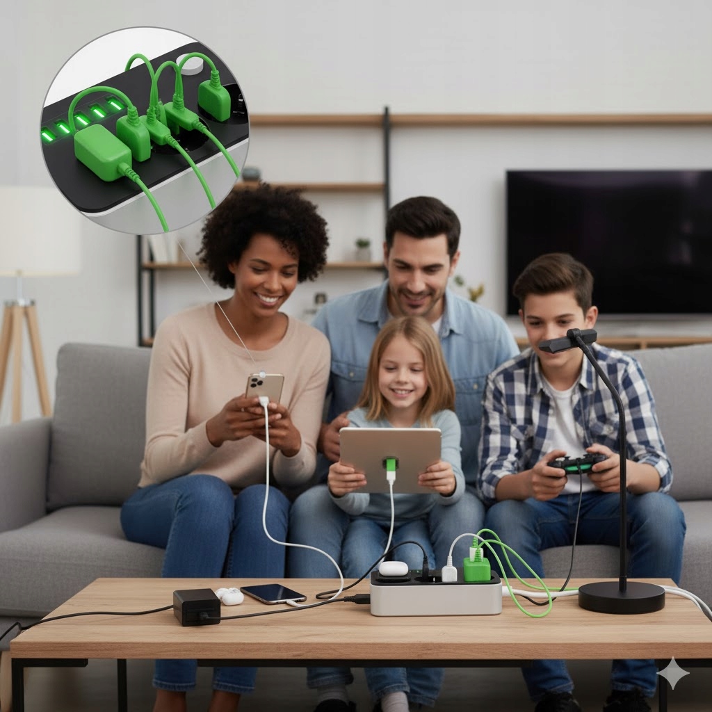 ✳️ Удлинитель имеет 6 USB-портов и 3 сетевых розетки, что позволяет одновременно подключить до 9 различных устройств.
