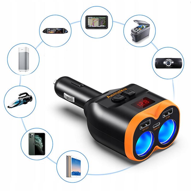 Это очень функциональный разветвитель для гнезда прикуривателя автомобиля. Изделие разделяет их на 2 дополнительных порта с максимальной мощностью. Дополнительным преимуществом являются встроенные два порта USB и один порт USB типа C. Благодаря этому несколько устройств могут использовать сплиттер одновременно. Благодаря нашему сплиттеру вы найдете место для подключения путевого регистратора, дорожного холодильника, навигации, телефонов, планшетов, ноутбуков и многого другого.