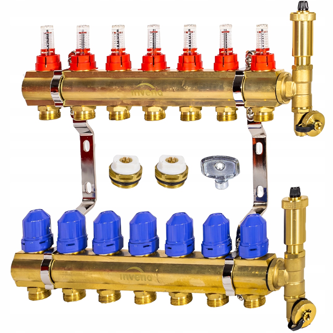 ✔️ Распределитель INVENA PM-05-007 (7 контуров) – латунные балки (2 шт), кронштейны монтажные (2 шт), 7 регулирующих клапанов с ротаметрами (2,5 л/мин), 7 термостатических вставок (для приводов), 2 латунных тройника, 2 сливных клапана, 2 автоматических воздухоотводчика 1/2", 2 ручных воздухоотводчика 1/2", воздухоотводчик ключ.