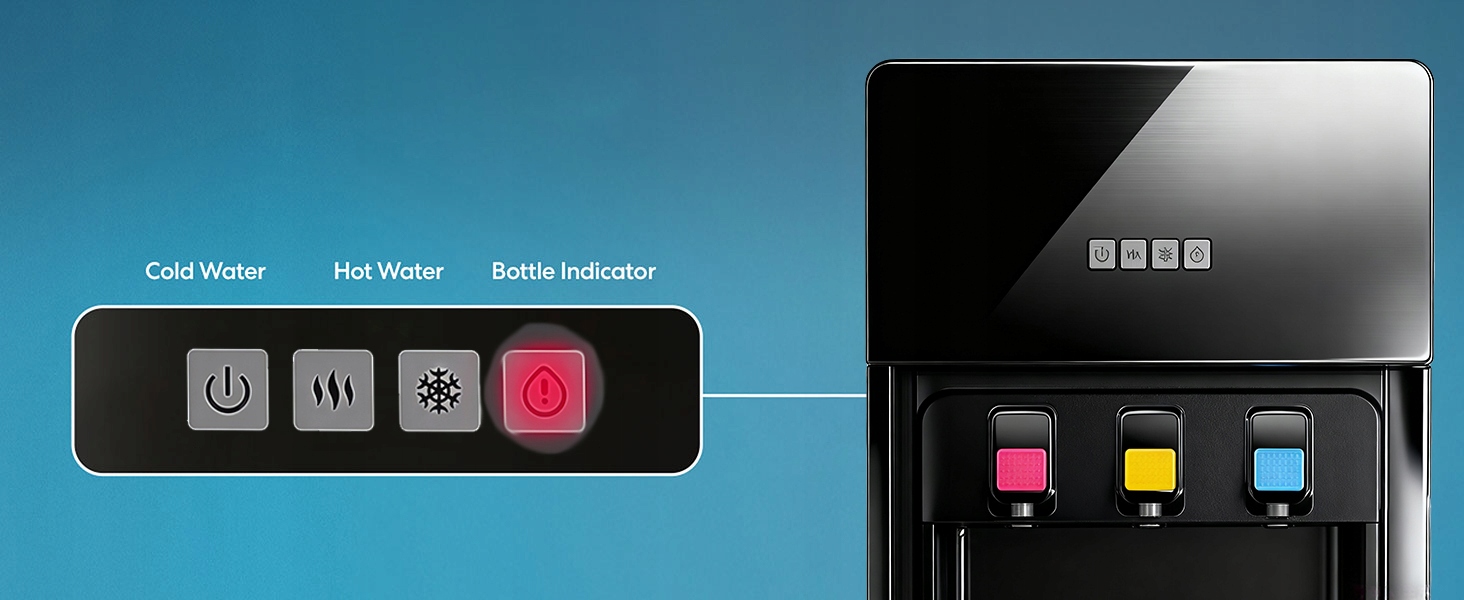 НИЖНИЙ ДОЗАТОР ВОДОХЛАДИТЕЛЯ С ТРИ НАСТРОЙКАМИ ТЕМПЕРАТУРЫ: НАГРЕВ, ТЕМПЕРАТУРА КОМНАТЫ И ОХЛАЖДЕНИЕ. У НЕГО ЕСТЬ СВЕТОДИОДНЫЙ ДИСПЛЕЙ С ПРЕДУПРЕЖДЕНИЕМ О ПУСТОЙ БУТЫЛКЕ.