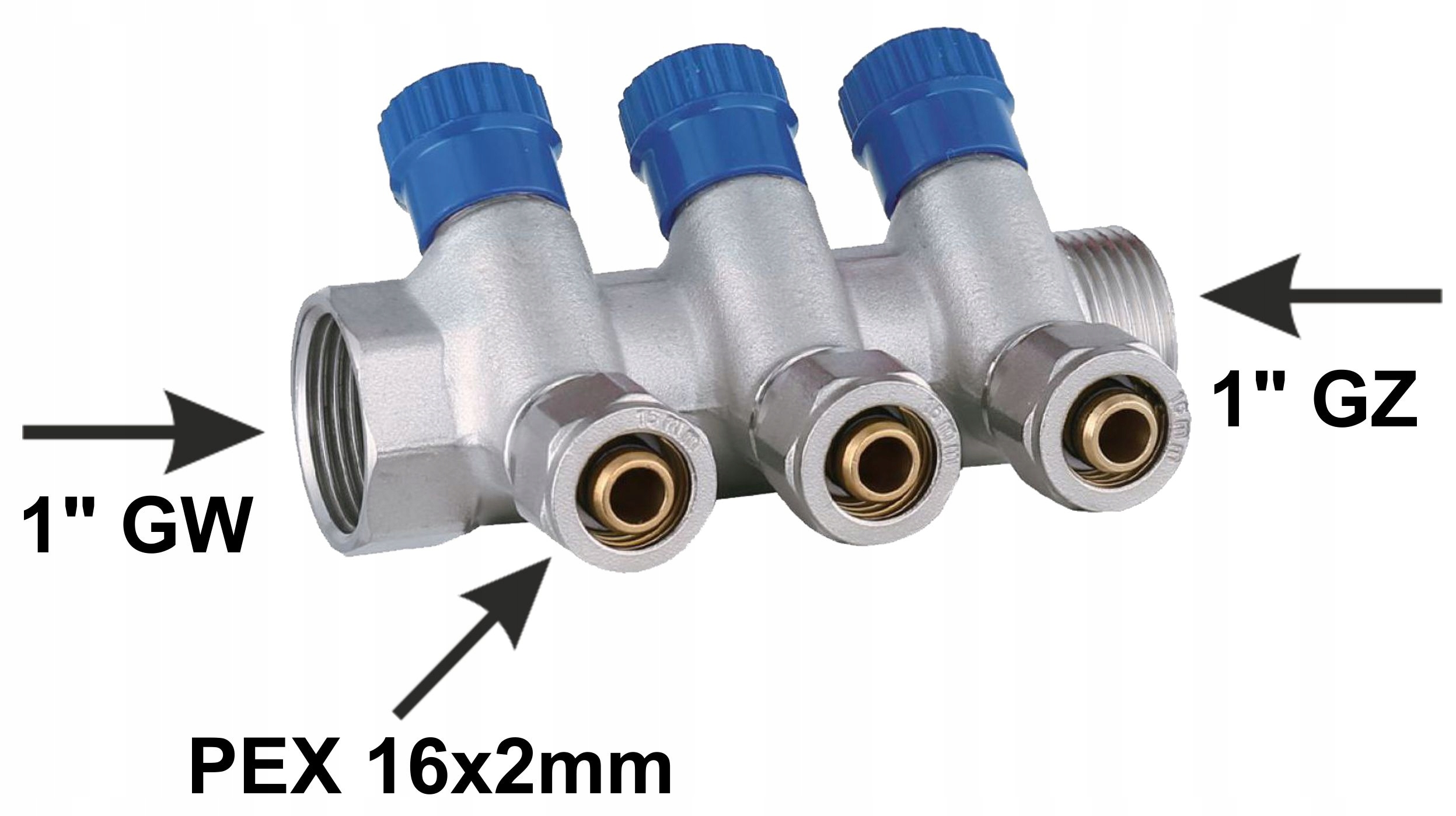 РАЗДЕЛИТЕЛЬ 1” x 16x2,0 мм PEX -- 3 КОНТУРА/СЕКЦИИ ХОЛОДНОЙ ВОДЫ -- 2 КОНТУРА/СЕКЦИИ ГОРЯЧЕЙ ВОДЫ