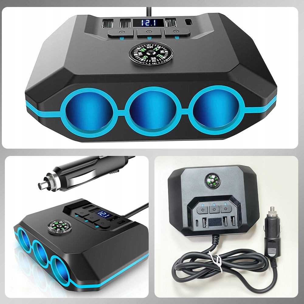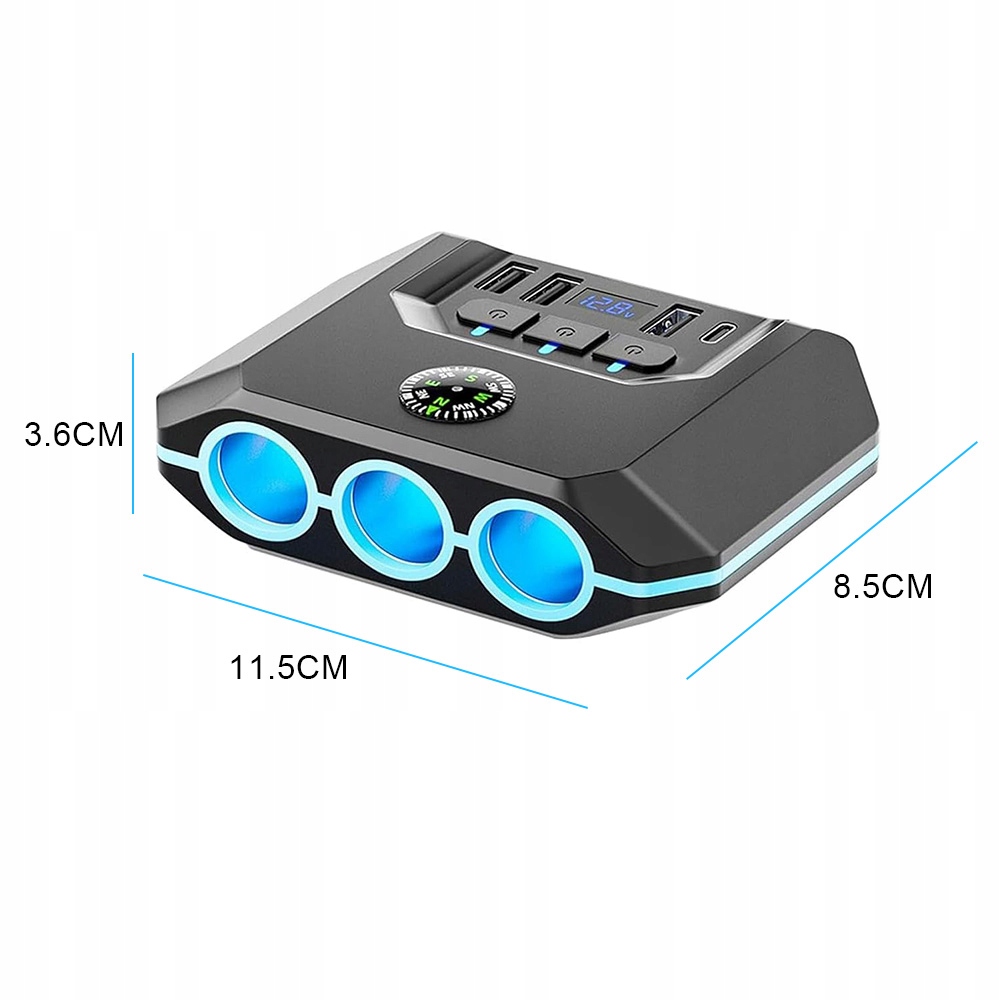 РАЗДЕЛИТЕЛЬ АВТОМОБИЛЬНОГО ПРИЖИВАТЕЛЯ 3x РОЗЕТКИ, ВЫКЛЮЧАТЕЛИ 1x USB 12В 24В