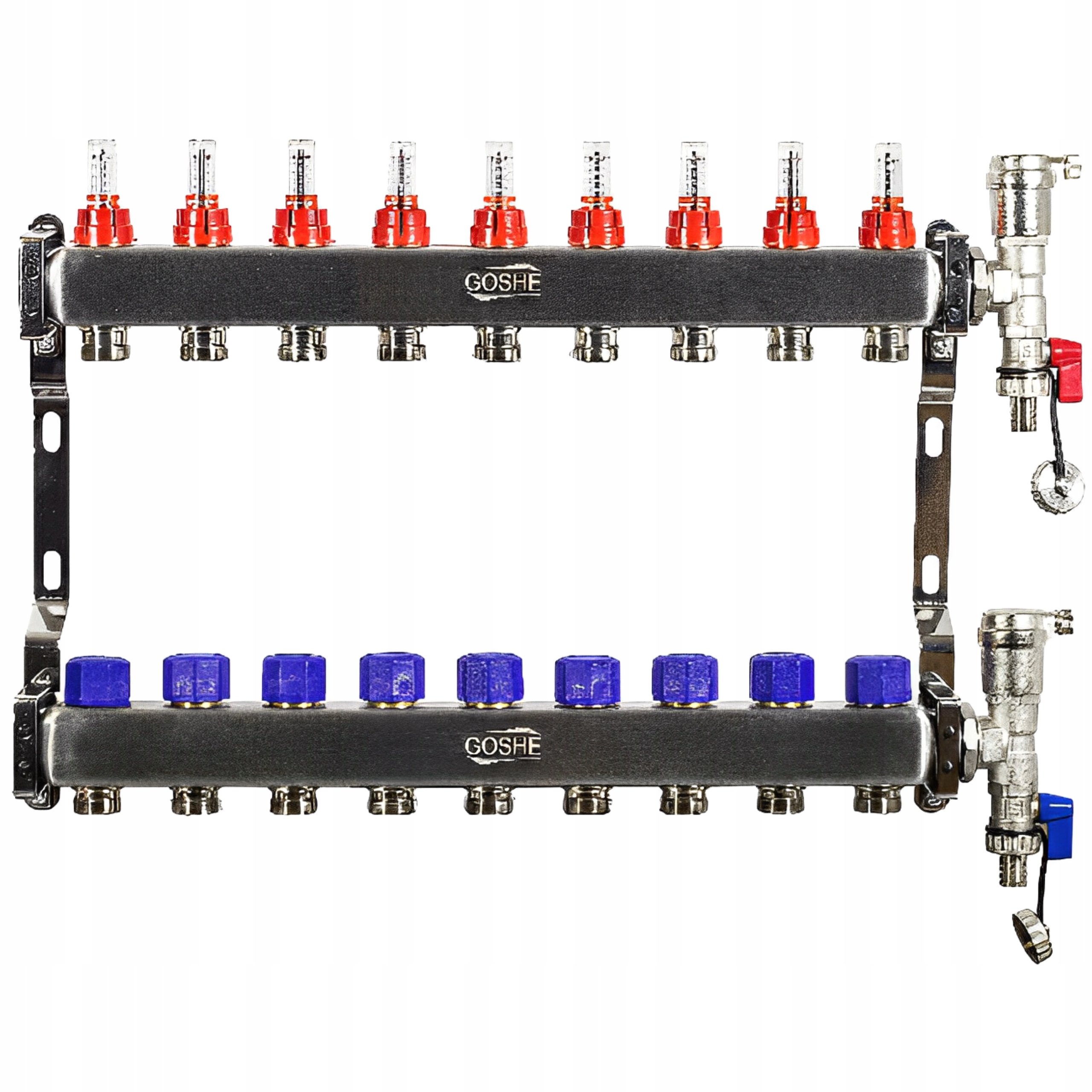 Полный комплект для нагрева основного нагрева и смешанных систем: Nickel-Plabled Damix с помощью насоса. 3 -Speed и термостатический клапан и 9 -го дистрибьютора Goshe с ротаметрами, вставки растений и полная фитинга. Это обеспечивает регулировку температуры (20-45 ° C), управление потоком и удобную установку в шкафу дистрибьютора.