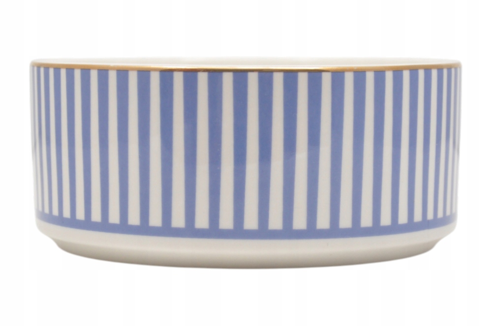 Внешняя часть чаши украшена симметричным узором из нежных вертикальных полос нежного синего оттенка, напоминающим спокойную элегантность скандинавского дизайна. Все увенчано золотым краем.