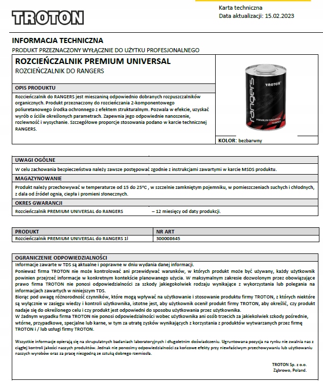 Разбавитель представляет собой смесь тщательно отобранных, высококачественных органических растворителей, идеально сбалансированных для повышения эффективности и оптимизации работы с продукцией Rangers.