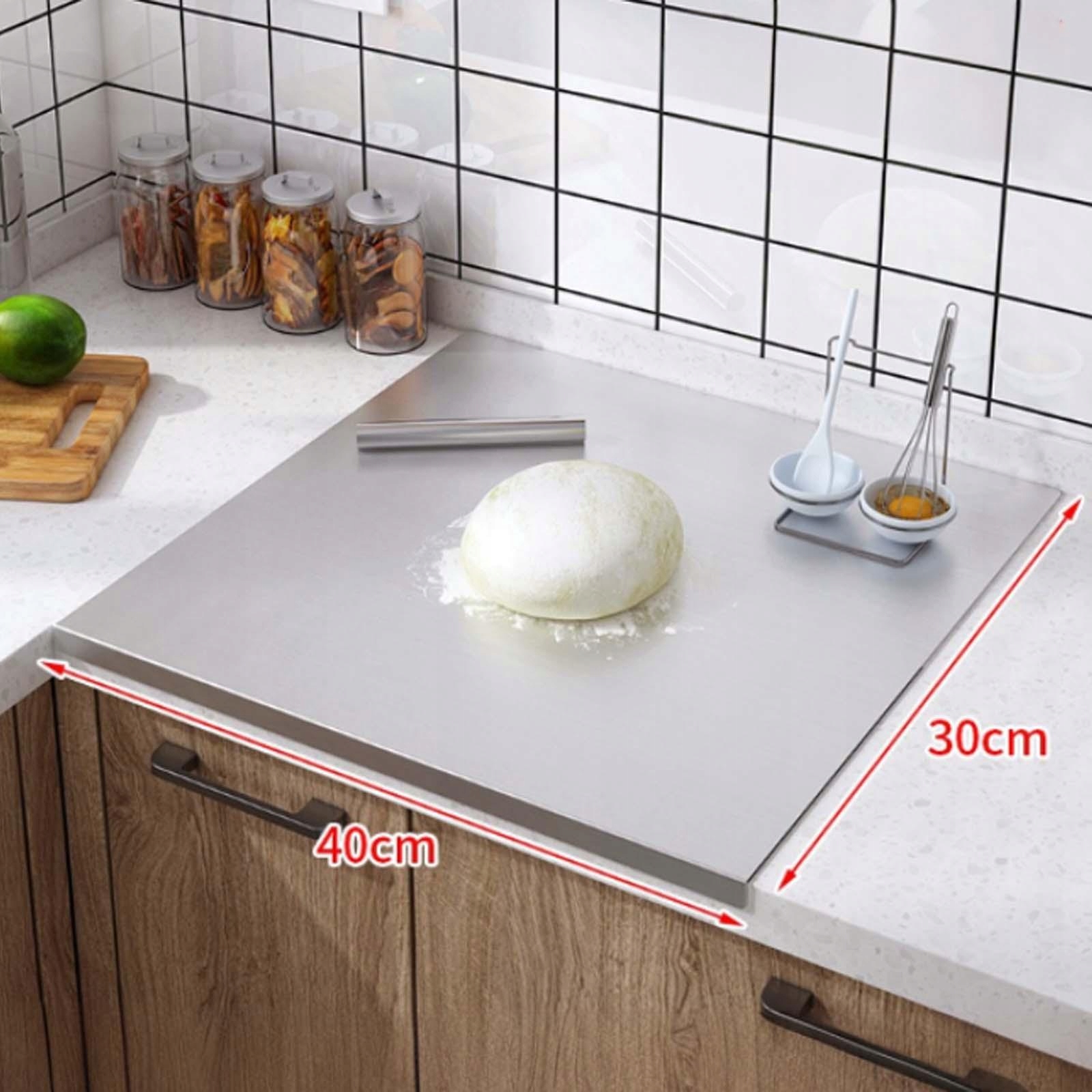 [Размер]: длина 40 см/15,75 дюйма, ширина 30 см/11,81 дюйма, толщина 1,5 мм (0,06 дюйма). Он идеально помещается на столешнице, а также добавляет на ней места.