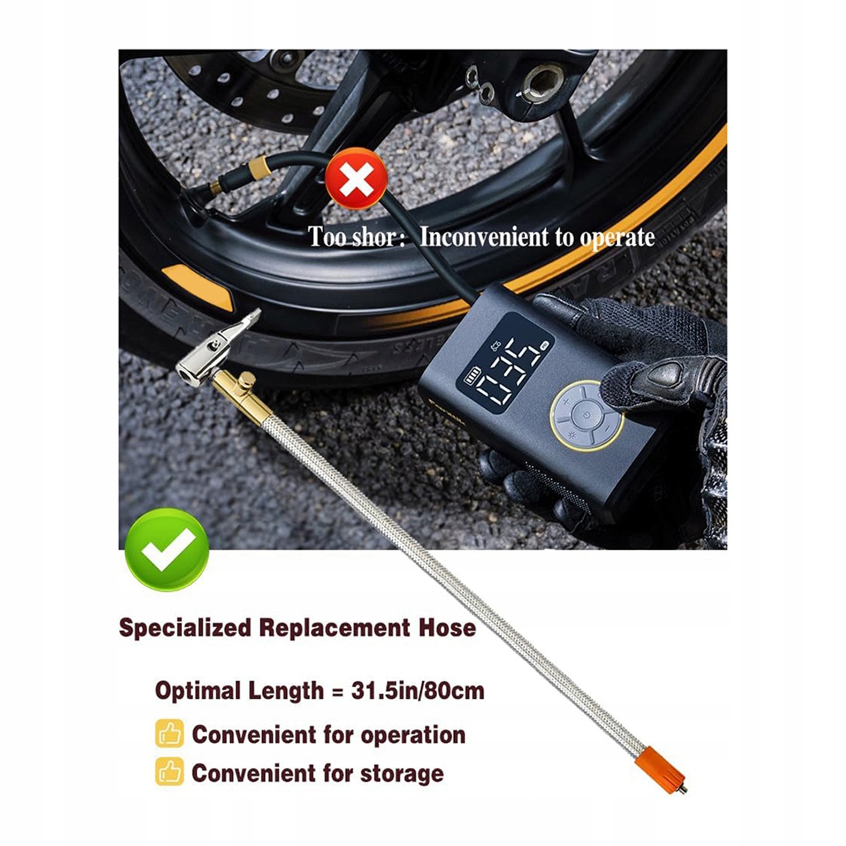 , специально разработанная для портативных насосов для шин: разработано таким образом, чтобы они были совместимы с различными портативными автомобильными воздушными компрессорами. Запасной шланг имеет однозначно соответствующий 6-мм разъем с внешней резьбой, разработанной специально для насосов, установленных в автомобиле. Внимание должно быть уделено его специфичности и тому факту, что оно не поддерживает другие типы интерфейсов. Его длина была разработана для оптимальной удобства использования в накачивании шин разных размеров и в то же время обеспечивает легкое хранение благодаря удобному размеру. сопла. Просто нажмите на оправку клапана шин и заблокируйте его. Защита обеспечивается сеткой из нержавеющей стали, обернутой вокруг шланга высокого давления. Конец подключения насоса усиливается резиновым рукавом, который обеспечивает теплоизоляцию, которая защищает пользователей от потенциальных ожогов в результате высоких рабочих температур. Шины для получения оптимального баланса и обеспечения безопасности дорожного движения. Прикреплено. Допустимая ошибка измерения составляет +/- 3-3 см