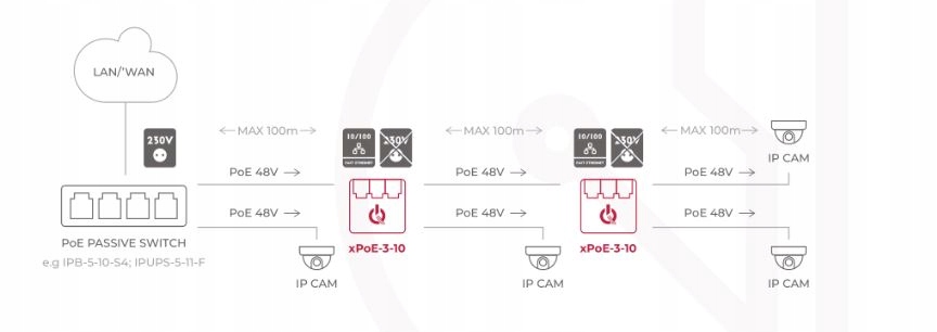 xPoE-3-10 был разработан как расширитель (повторитель) сетей LAN и источника питания PoE< /б> . Регенерирует сетевой сигнал и передает питаниеPoE на выбранные выходы. Чаще всего используется как «усилитель» для расширения сети на участках длиной более 100 м. Кроме того, он идеален в качестве «активного сплиттера» в ситуациях, когда нам нужно подключить несколько PoE-приемников (например, несколько IP-камер) к одному кабелю или когда нам нужно создать дополнительную ветвь сети.