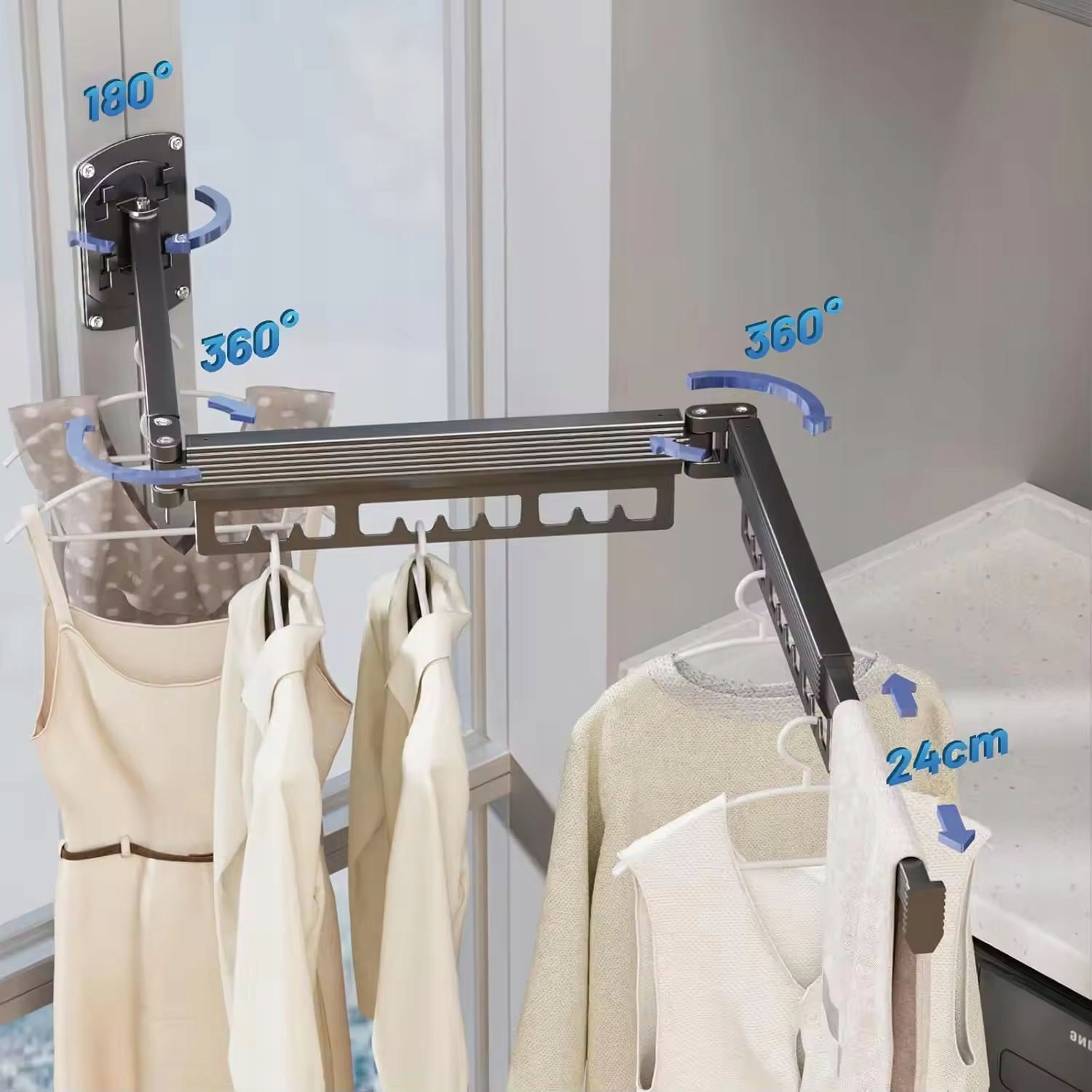 Телескопическую вешалку можно поворачивать на 180° влево и вправо, а складную штангу можно регулировать на 360°. Когда вешалка не используется, ее можно полностью сложить и прислонить к стене, экономя ценное пространство. В полностью разложенном виде на нем можно сушить одежду всей семьи одновременно. Телескопическую штангу на конце настенной вешалки можно легко убрать и убрать.