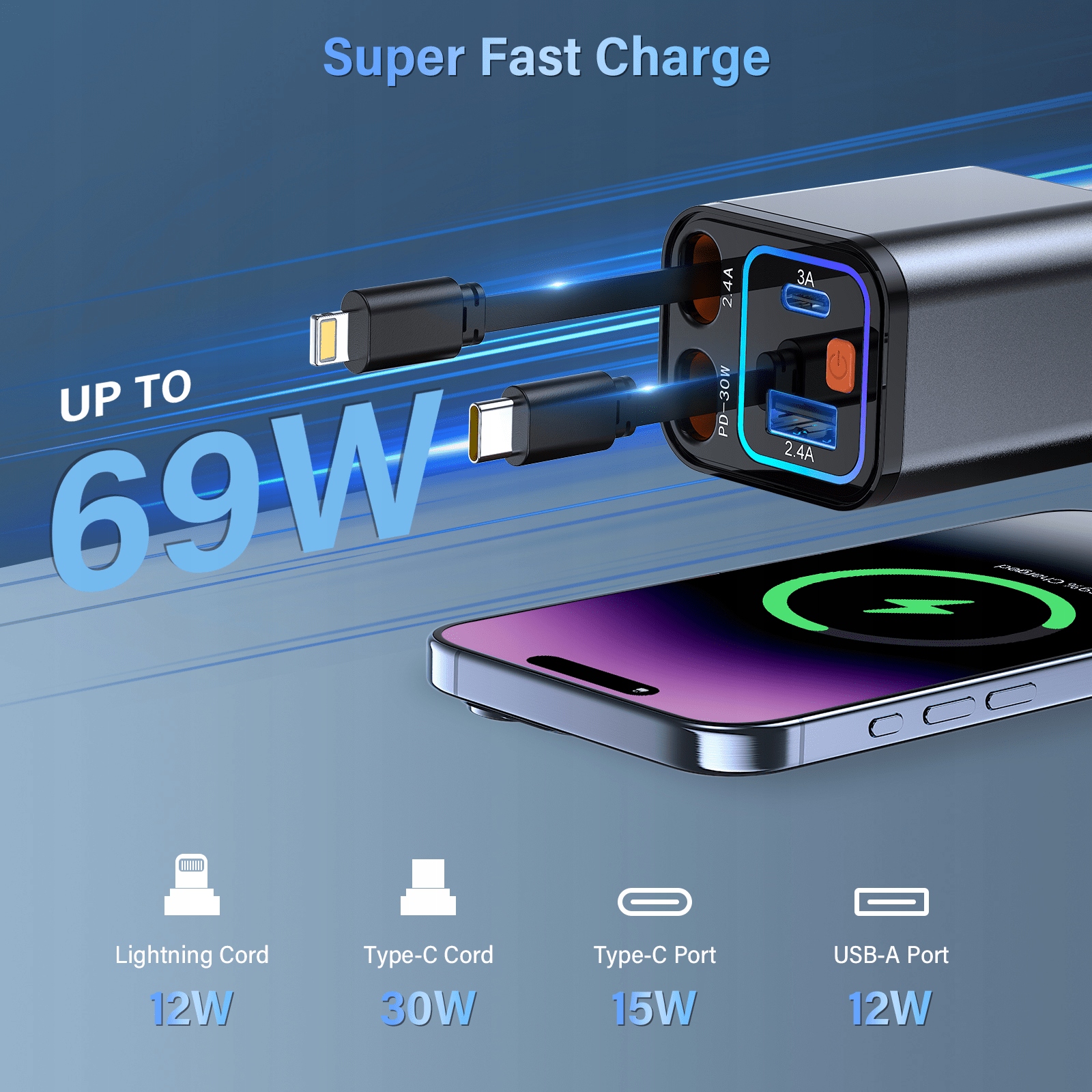 ⚡ Сверхбыстрая зарядка 69 Вт MAX: поддерживает общую выходную мощность до 69 Вт, что в несколько раз быстрее, чем обычные автомобильные зарядные устройства. Это значительно сокращает время ожидания зарядки, позволяя вам продлить часы навигации или воспроизведения музыки всего за несколько минут.