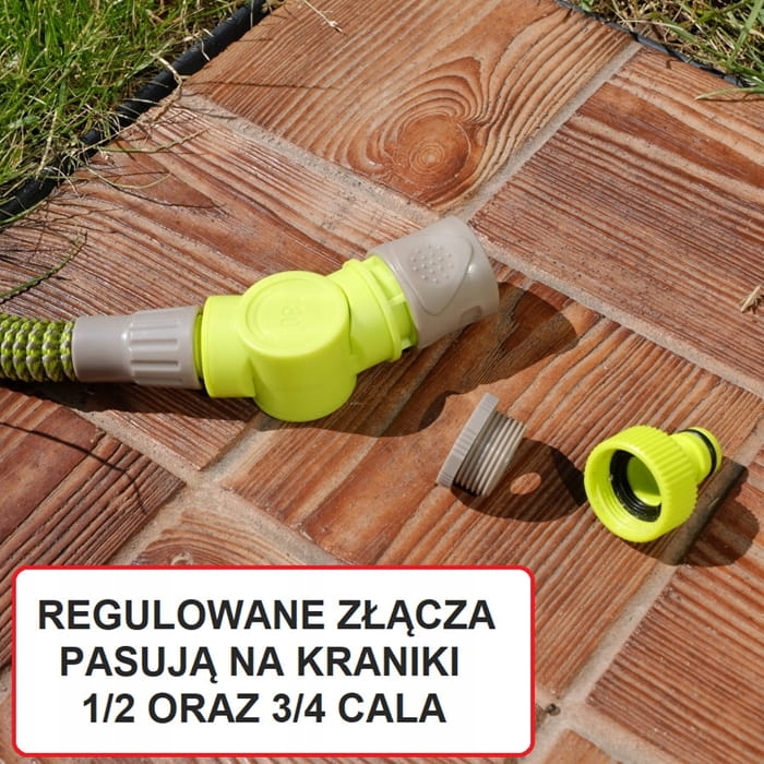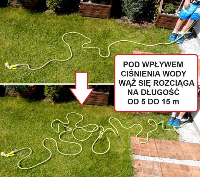 Удлиняемый садовый шланг из высокопрочного полиэстера с оплеткой 600D для защиты от повреждений. Для производства использовались самые современные технологии. Шланг удлиняется в 3 раза благодаря напору воды, а после отключения воды укорачивается.