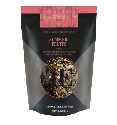 Teahouse Luxury Summerfruits — фруктовая смесь с кусочками сочных яблок, черной смородины и малины. Настой по запаху и вкусу напоминает фруктовый сад летом.