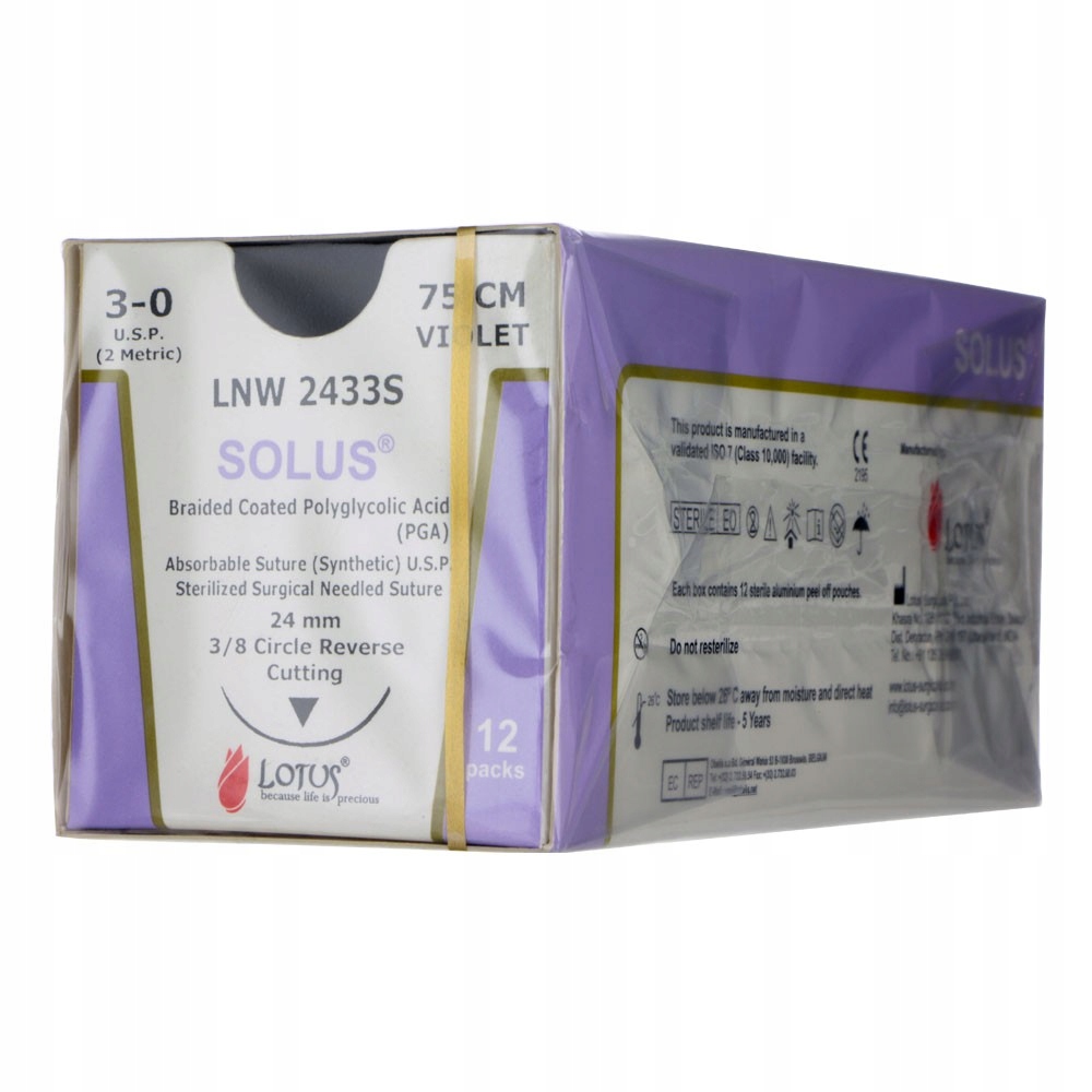 Рассасывающиеся нити торговой марки Solus представляют собой синтетическую рассасывающуюся нить в виде оплетки, изготовленную из полигликолевой кислоты. Цвет косы фиолетовый, срок впитывания от 60 до 90 дней. В упаковке 12 пакетиков.