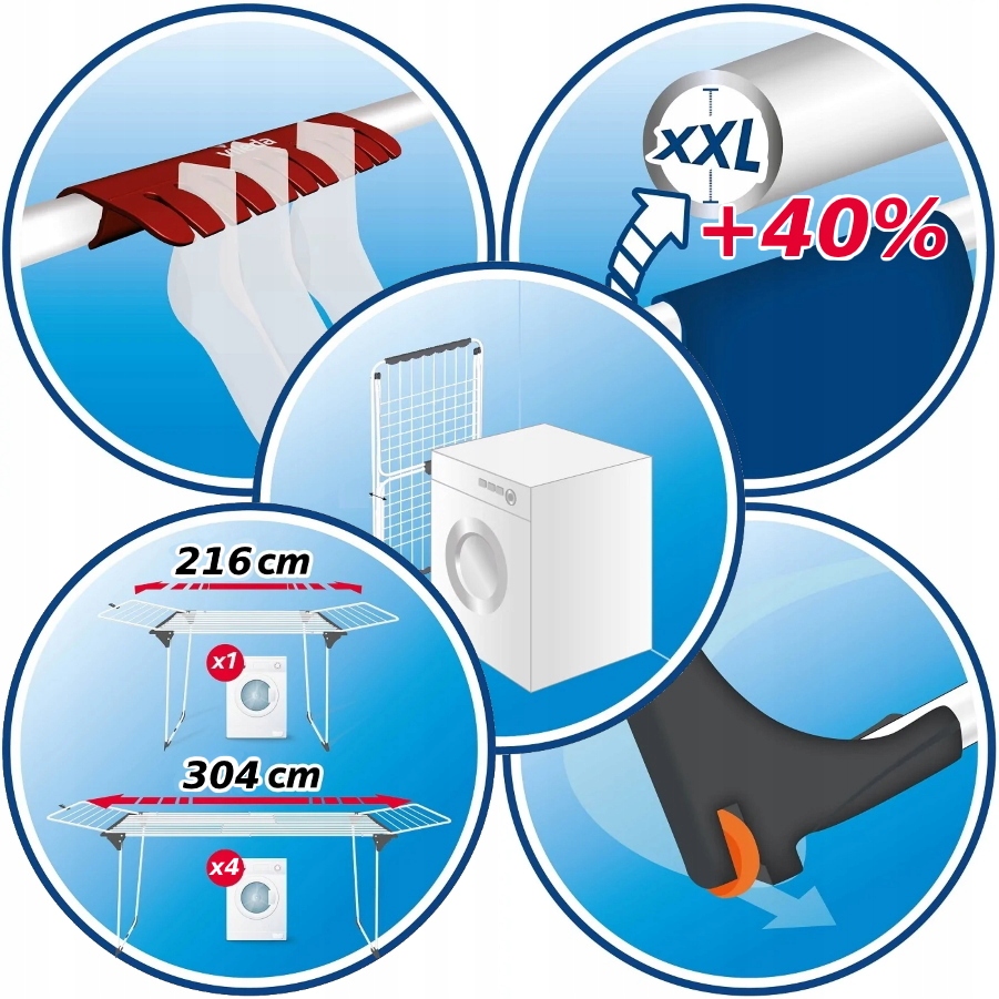 Меньше складок – легче гладить: Толстые алюминиевые провода размера XXL сушильной машины Vileda предотвращают появление складок на одежде. при этом сокращается процесс глажки.