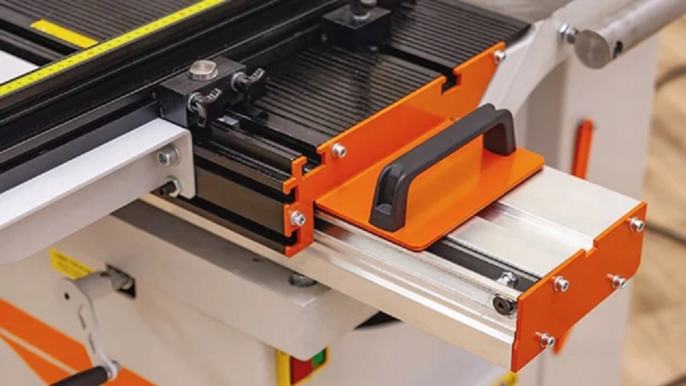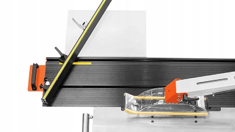 Пила оснащена двумя направляющими для облегчения настройки материала на распил: параллельная направляющая с микрорегулировкой до десятых долей миллиметра и поперечная направляющая с регулировкой угла реза, которую можно разместить с обеих сторон стола. .