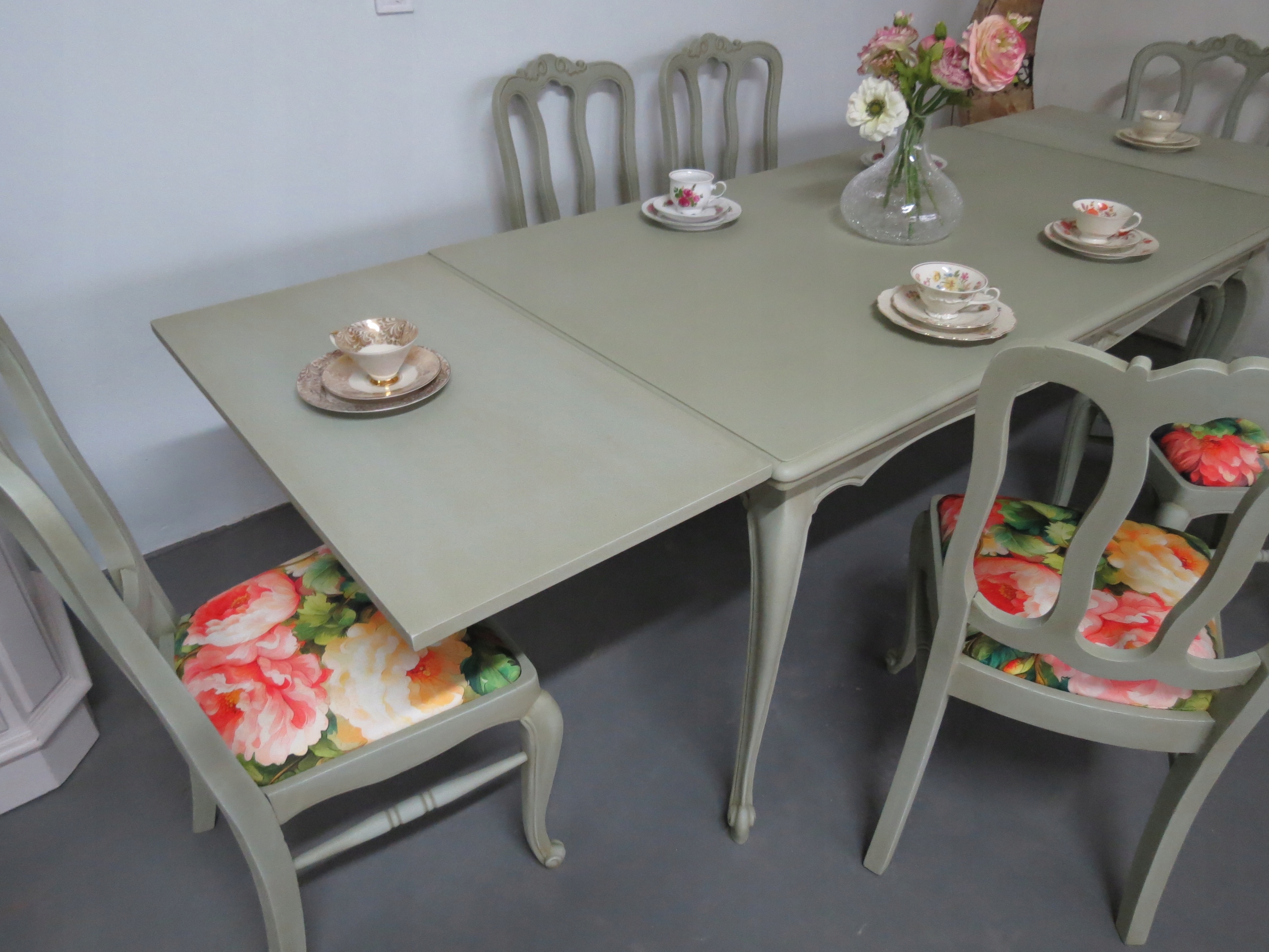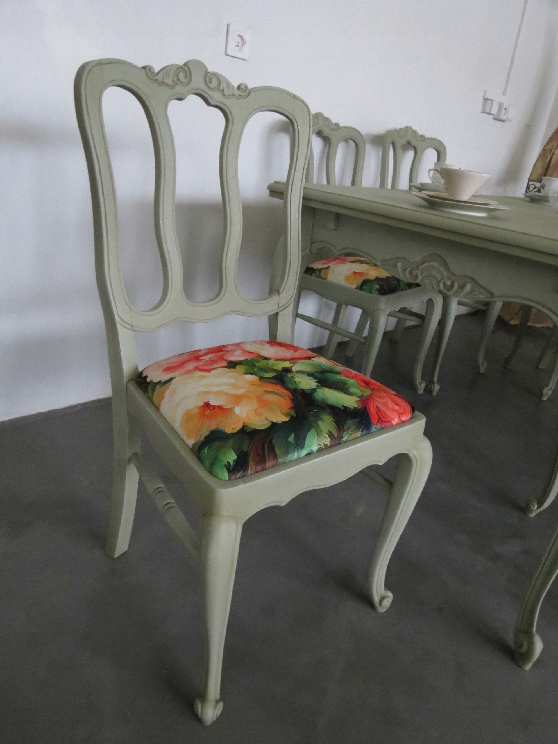 Стол расписан вручную в нежном шалфейном цвете из палитры красок Nordic Chic от Wood & Crafts, а затем аккуратно патинирован более темным воском, что придает ему благородный, состаренный характер