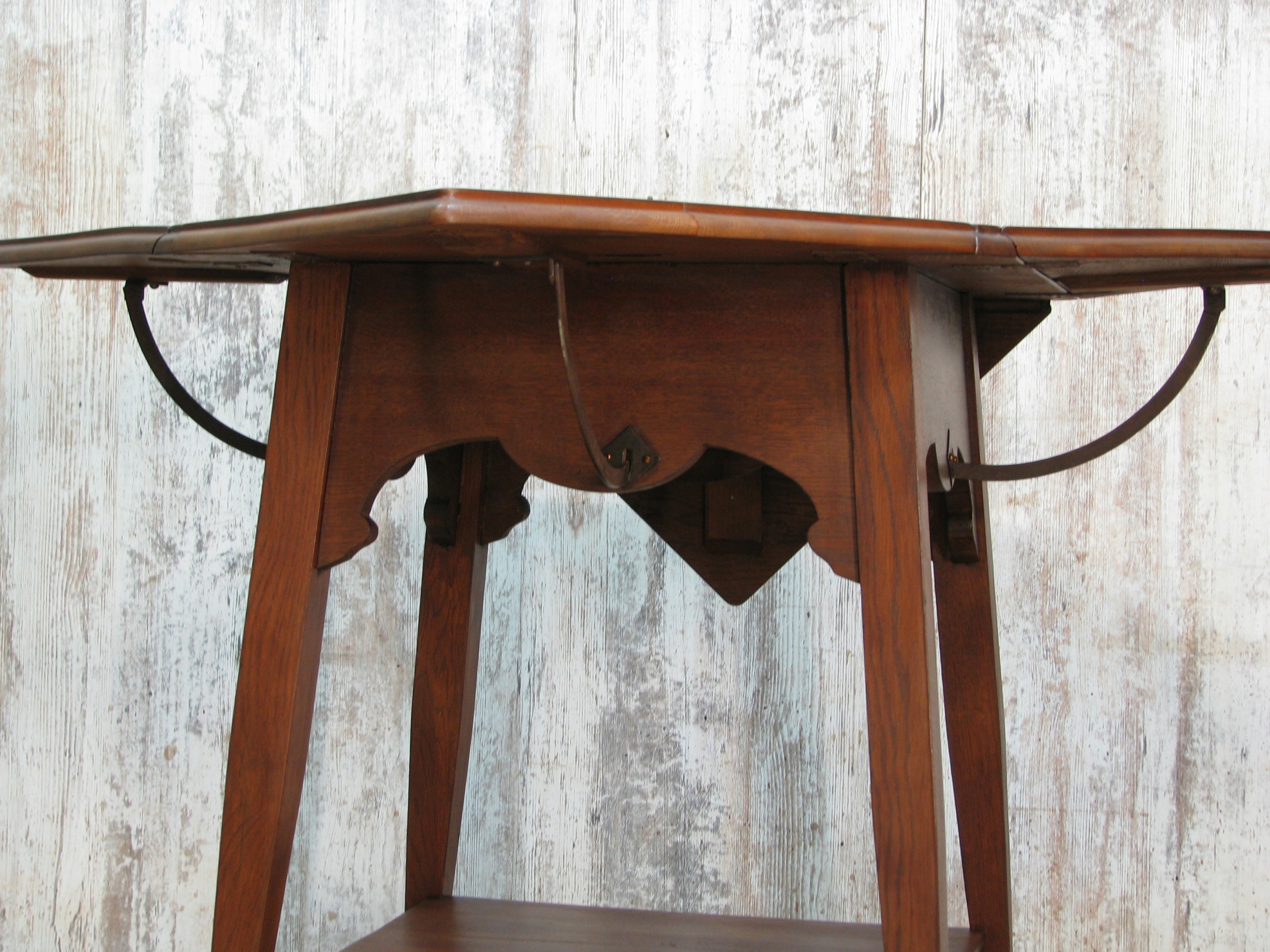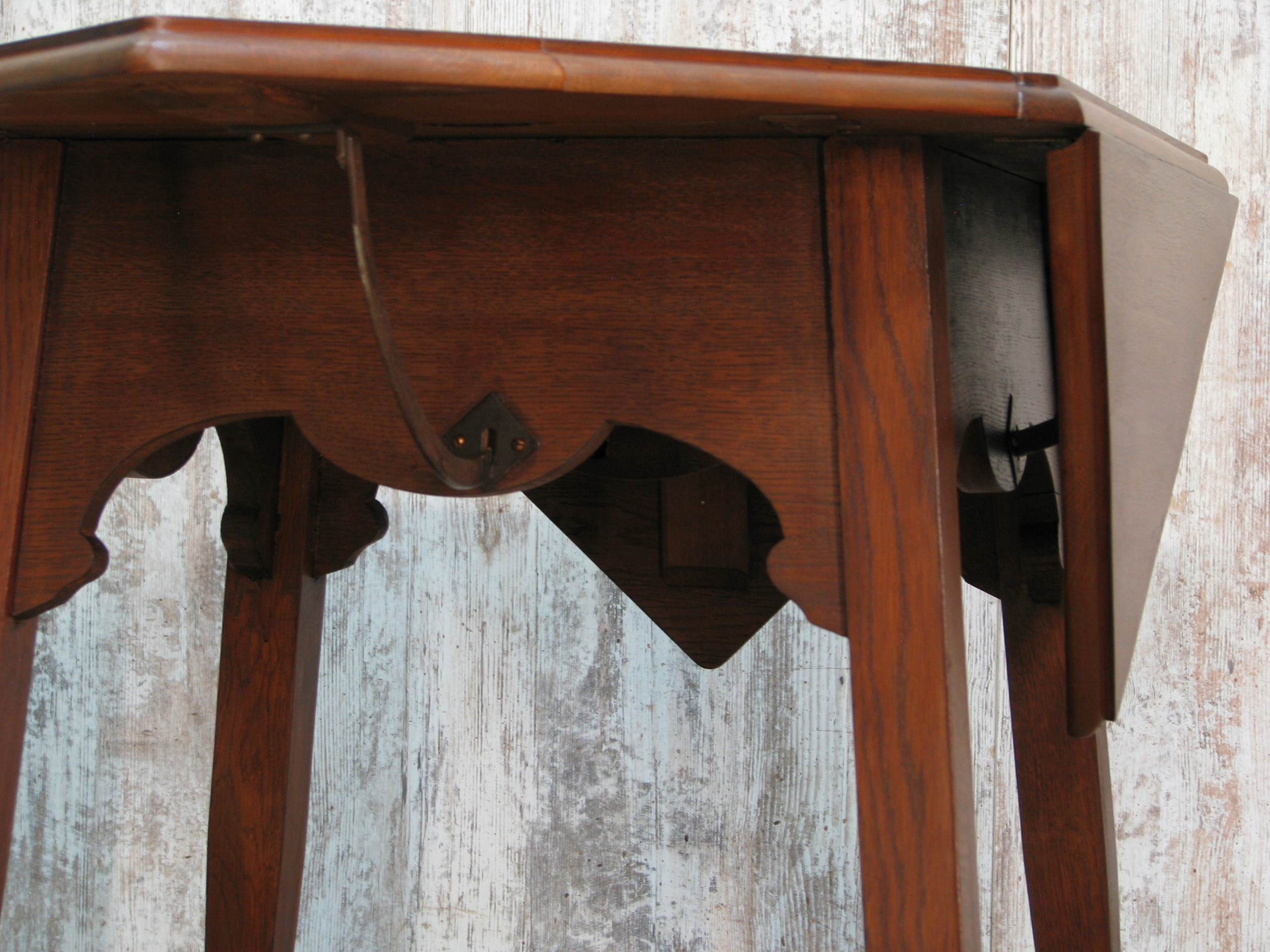 Мебель очищена и покрыта лаком. На столешнице видны легкие следы использования, вставки из старого шпона, царапины, подчеркивающие возраст и характер старой мебели. Предмет мебели из древесины дуба.