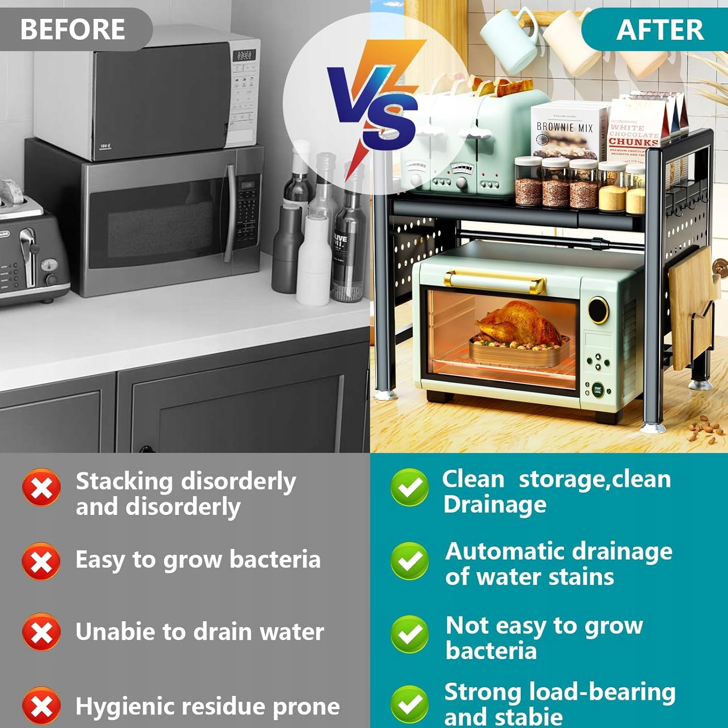 Кухонная полка подойдет не только на кухне, но и в комнате, кабинете или гостиной. Его можно использовать для настройки микроволновых печей, духовок, тостеров, кофемашин, принтеров или факсов. Дополнительные 6 крючков позволяют повесить мелкую кухонную утварь, увеличивая место для хранения.