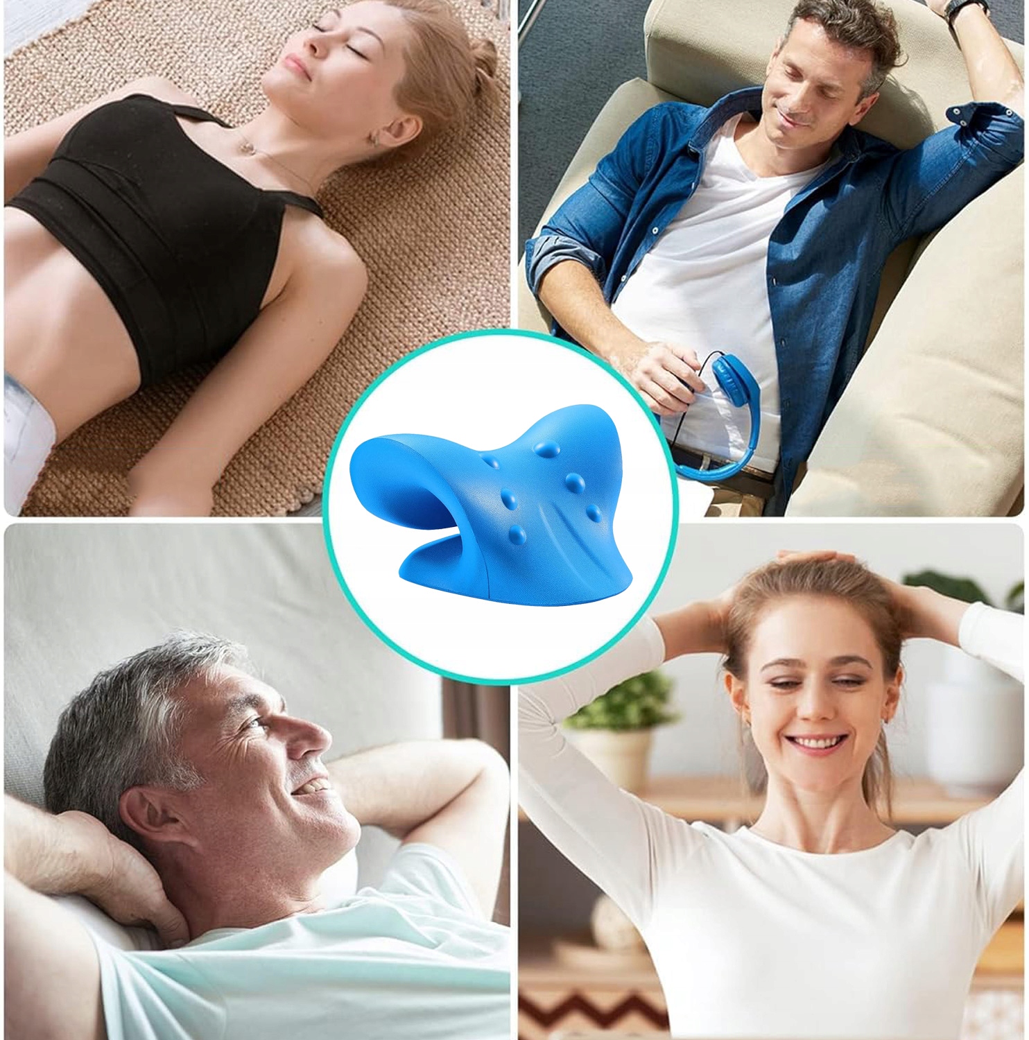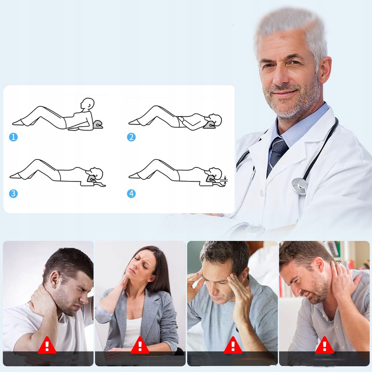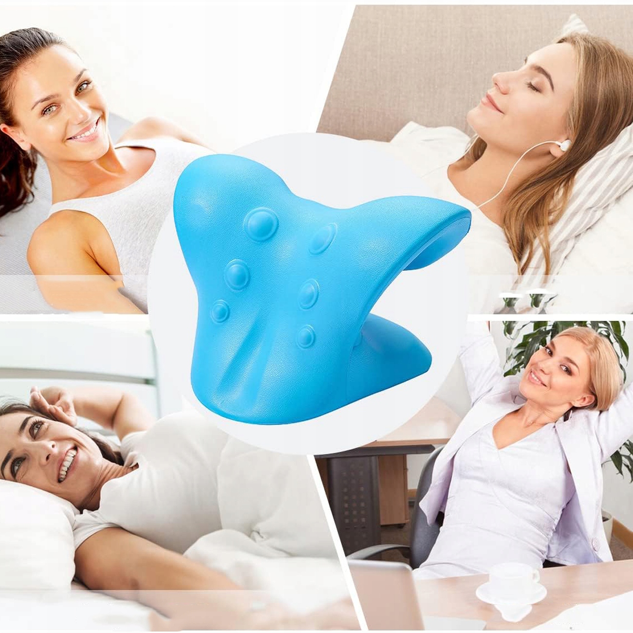 1️⃣ Найдите удобное место и воспользуйтесь растяжителем для шеи, чтобы расслабиться на несколько минут. Рекомендуется использовать устройство на полу или на жестком матрасе.