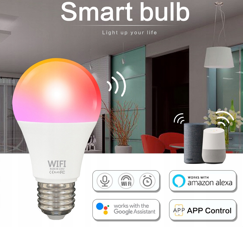 Светодиодная лампа WiFI 9 Вт, подключение TUYA / SMART LIFE, включение/выключение на смартфоне или ALEXA, GOGGLE HOME/ASSISTANT — голосовое управление.