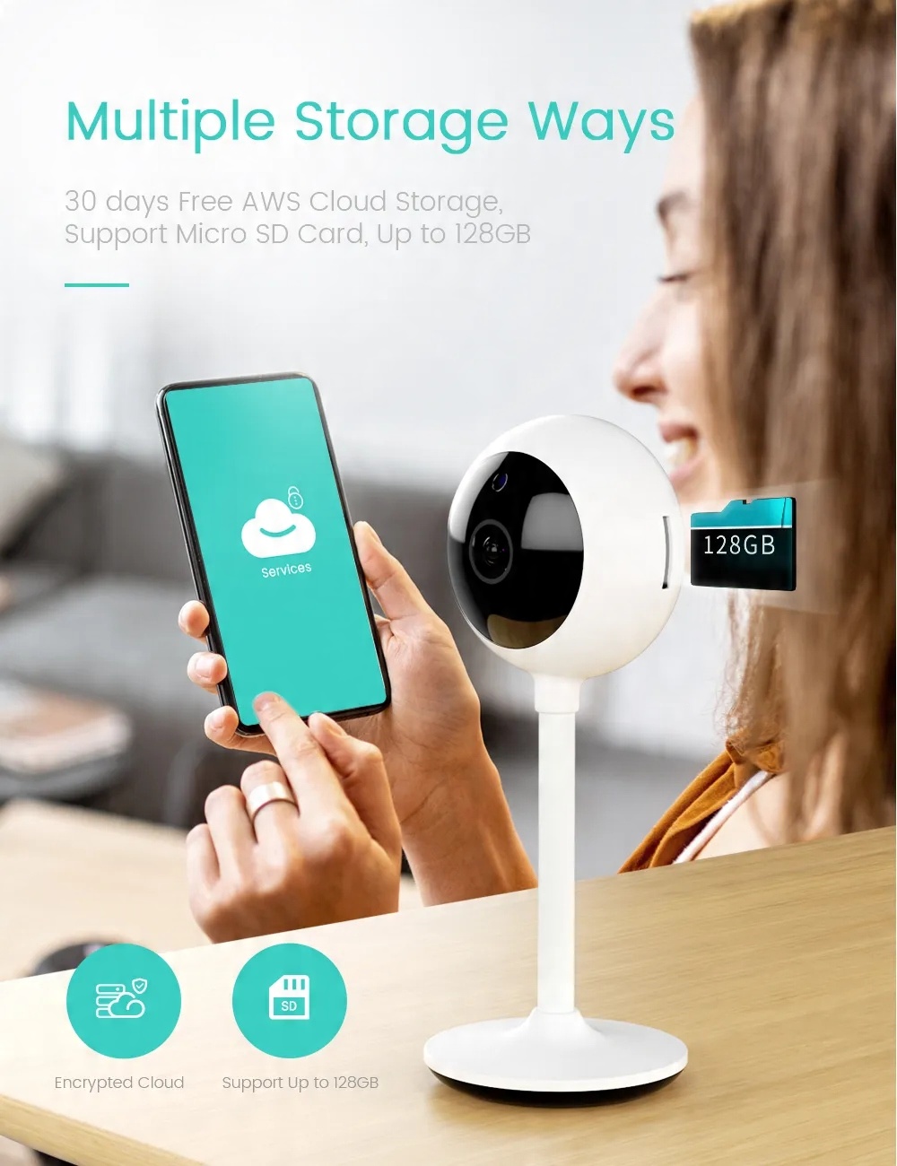 Вы можете получить 30 дней бесплатного облачного хранилища с 72 часами записей, чтобы избежать риска потери карты памяти. Технология финансового шифрования для облачного хранилища, максимальная защита данных и конфиденциальность. Никто не сможет получить доступ к вашей камере или информации без вашего разрешения. Поддержка локальной памяти до 128 ГБ.