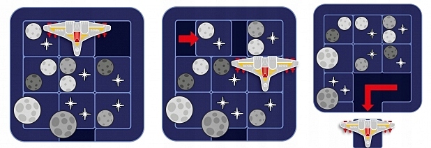 2. Перемещайте кусочки головоломки по доске, чтобы ваш космический корабль мог уйти, но вы должны следить за астероидами, преграждающими путь.