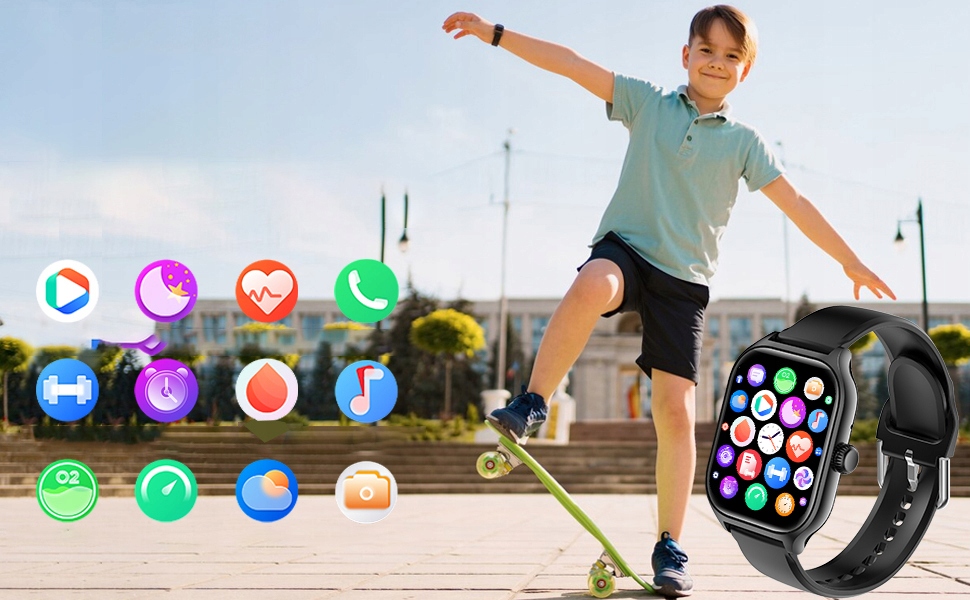 Многофункциональный трекер активности для детей: десять умных часов для детей, предлагающих ряд интимных функций: переключатель активности (шагомер, калории), пульсометр , встроенный режим сна, спортивные режимы, SMS-сообщения и приложения (WhatsApp, Facebook, Messenger...), отображение времени, дистанционное управление устройствами и устройствами, прогноз погоды, напоминание о сидячем положении, будильник, секундомер, поиск телефона, регулировка настроек, и т. д.