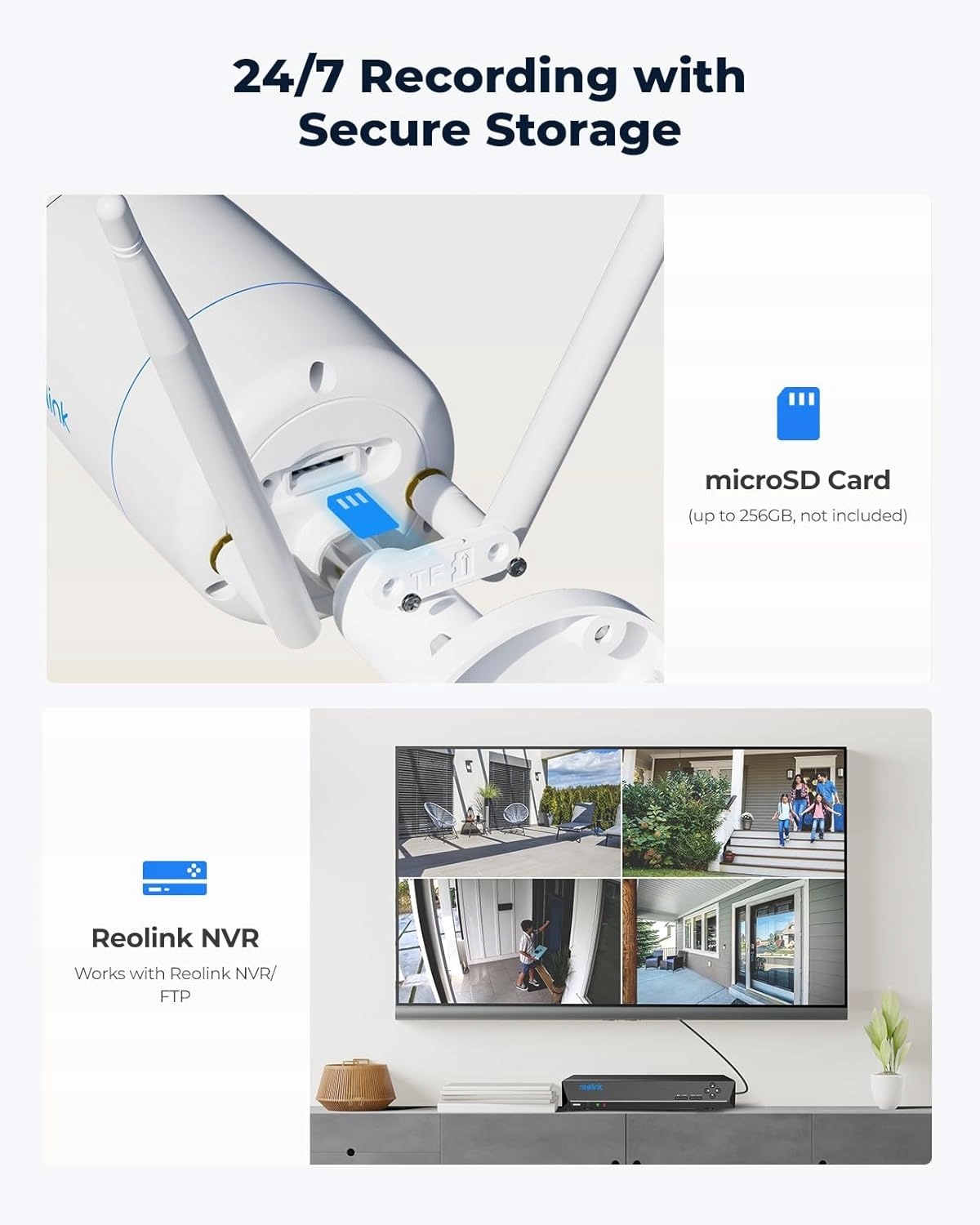 - Гибкие параметры записи: видео материал может быть записан локально на карте MicroSD (до 256 ГБ - проверьте спецификацию производителя максимальной емкости), для выделенного рекордера) NVR Reolink или использовать безопасную опцию записи в облаке повторного переподготовки.